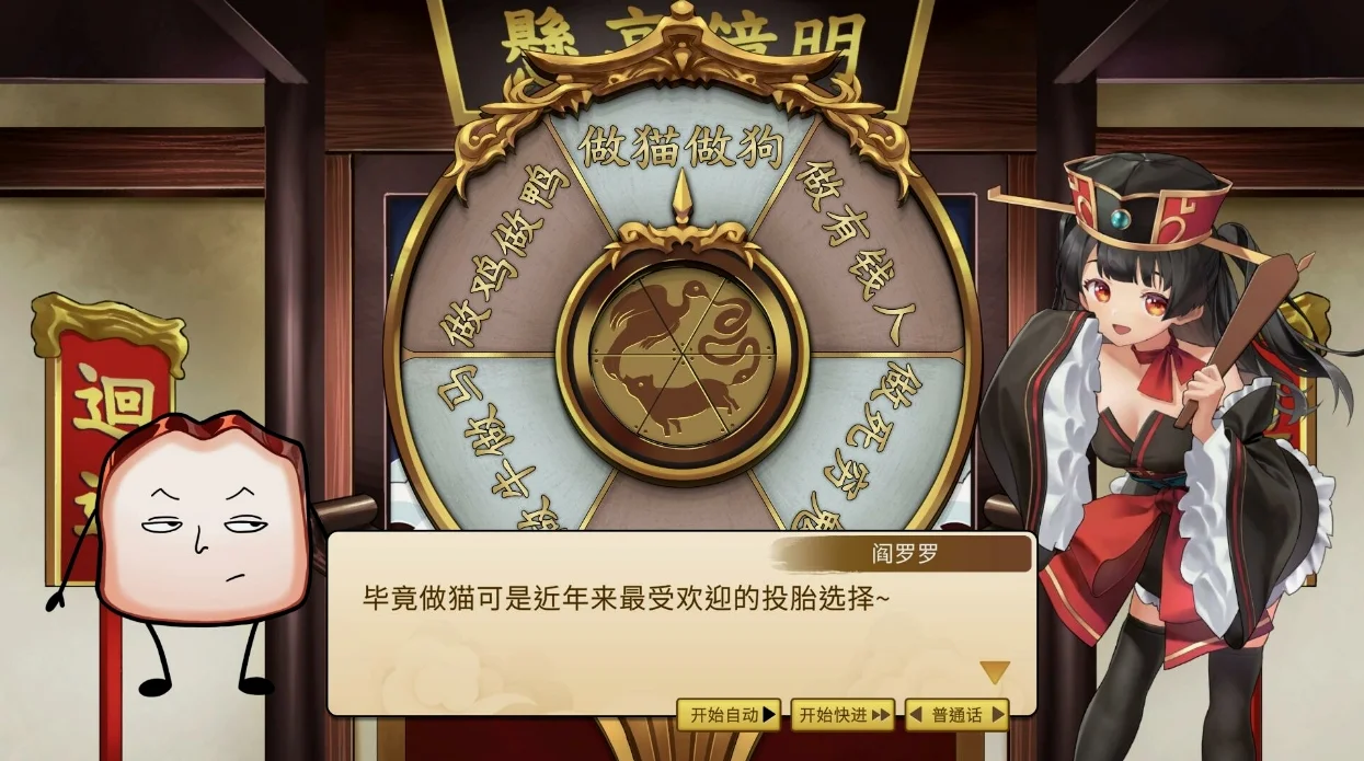 游戏的玩法较为简单,平时在各处可爱的场景里溜达,和各种卡通可爱的角色闲聊,比如阎罗的二次元女儿阎罗罗,还有路人甲乙丙丁一般的牛头马面(同样也是相当可爱的造型立绘,是能出抱枕的模样),还有貌似孟婆一样的商店销售员、狐媚子一般让人血液冲动的娱乐中心幕后老板,这些神话中阴曹地府的知名角色如今都是以卡通Q版的形象出现在我们面前,文本对白走的无厘头粤语文本方式,相当有感觉。
