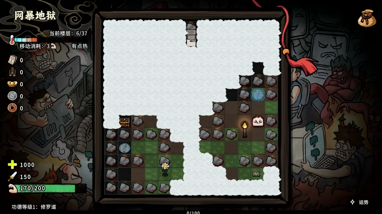 主要的任务还是下地府“巡查”,寻找“轮回碎片”修补好“轮回大转盘”。这个过程是以我们小时候游戏机“敲地砖”的方式进行的,在地图探索部分我们需要以消耗体力的方式来探索被迷雾遮挡的路径,“空调”可以当做是通关开关,触摸之后可以不消耗体力探索本层,搜寻所有物品宝物宝箱之后进入下一层,最终进入各楼层的战斗房间,触发战斗,击败守关BOSS(各种鬼),获取附身在他们身上的“轮回碎片”,同时也让主角叉烧兄感应一些“轮回之力”来窥探前世的记忆。