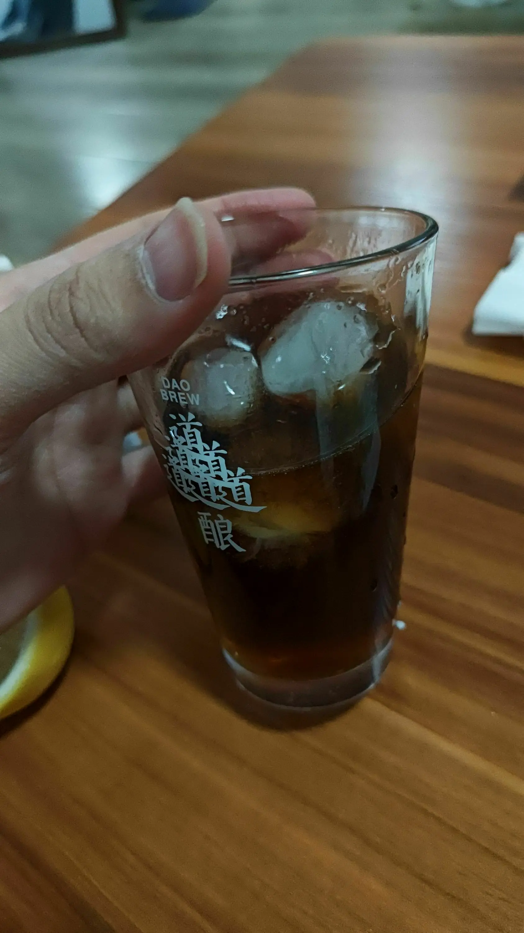 金酒本身很多都是泡了草本的植物,加上崂山可乐它的配料表里面也有着香料、咖啡液和枣汁(为什么竟然会有枣汁),就使得整杯酒的味道非常的浓郁甘甜,像是小时候吃过的可乐和太妃糖口味双拼的阿尔卑斯棒棒糖!