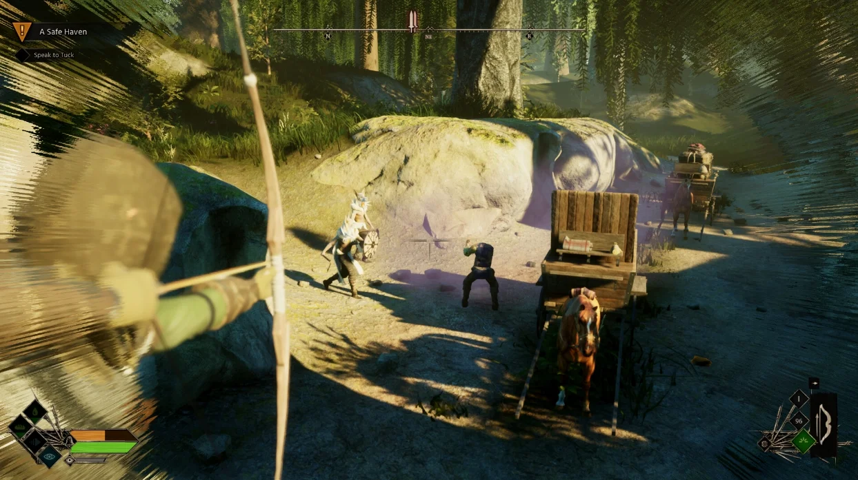 战斗方面游戏采用的是第三人称动作即时战斗,在射箭的时候那种饱满的射击手感是相当优秀的,角色总是偏身于屏幕正中点的视觉应也是为射箭系统准备的,毕竟这也是罗宾汉的成名绝技!但也恰恰是这点导致游戏近身战斗的视角会相当的别扭,角色不是正面对着敌人的剑术多少还是缺乏那么一点味道!