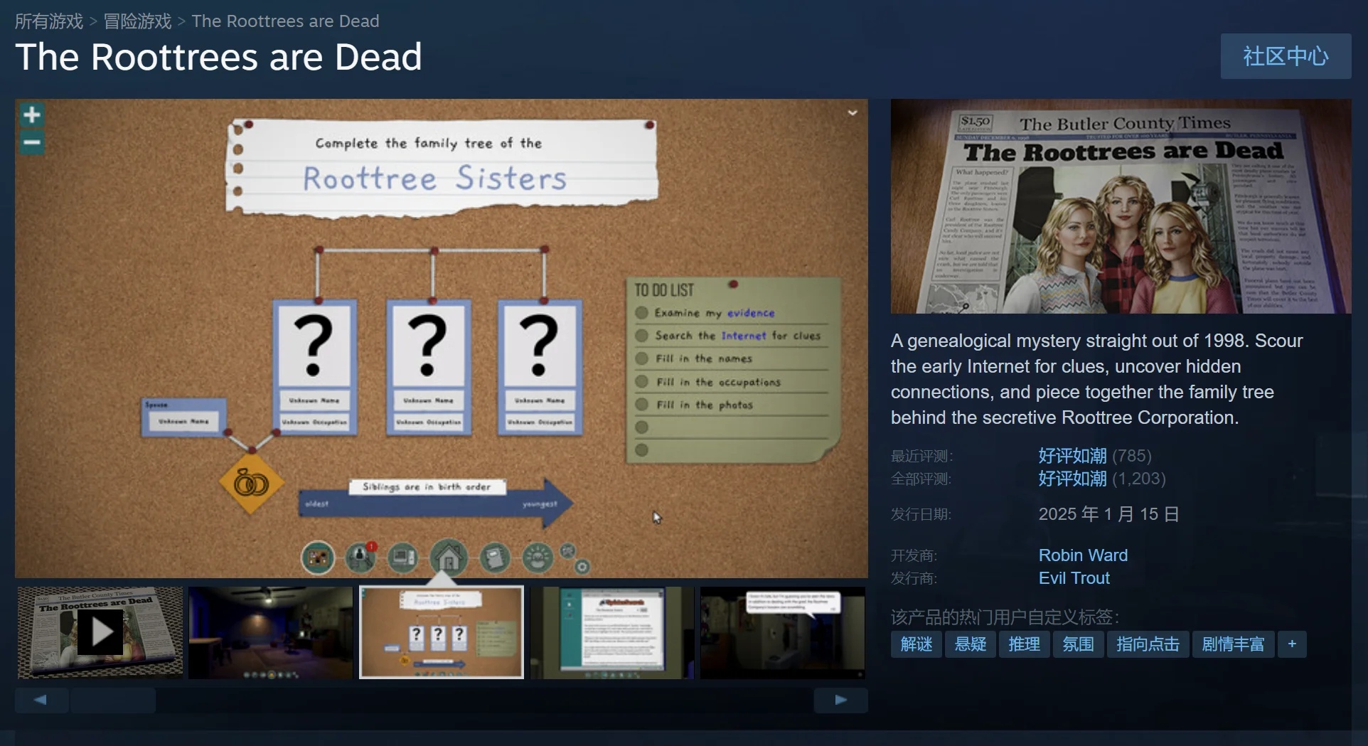��本次介绍最最推荐的点击解谜推理游戏!游戏前身是一款gamejam参赛作品,以其独特的家族树推理而被解谜玩家熟知。正式上线的版本增加了新的剧情。不想剧透所以就不多介绍了,一定要去了解一下!想玩中文的朋友也可以蹲一蹲补丁或者官中。