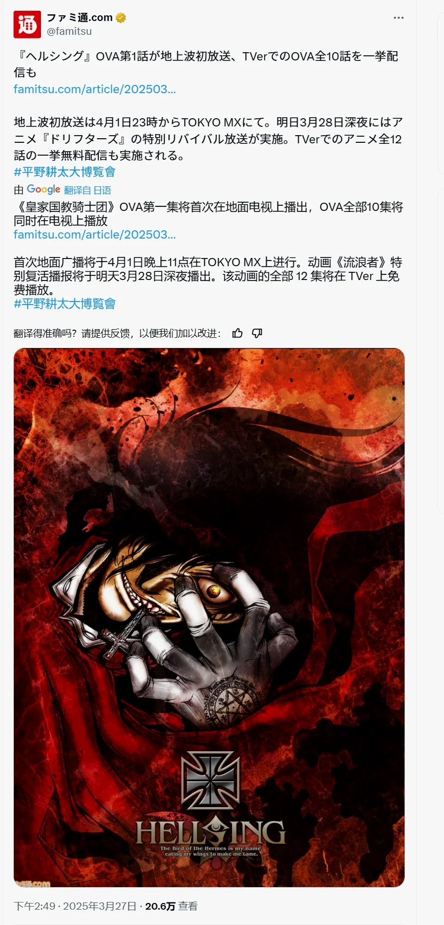 - Hellsing OVA要首次在电视台放送了