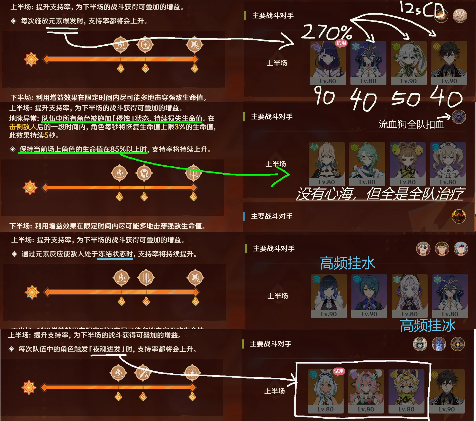 这次格斗赛打Boss活动很好解决了上面几个问题。首先他解决了不带脑子点击点击选Buff的情况,Buff仍然有但必须通过一系列和数值DPS无关的挑战获取,而这一点很好利用了原神战斗系统宽广的特色,利用不同的敌人和不同的系统要求来获取增益。如图1所示,几乎所有的挑战都是和机制相关的,第一行的雷神给全队充能机制+动动脑选低能耗低CD的角色增加开大招的次数;第二行关卡机制和敌人流血狗会疯狂降低全队血量,那芭芭拉琴姐妹这个开局就有的全队持续回血发挥了用处;第三行要求触发尽可能多的冻结,这就涉及到元素反应,而我的队伍中三个角色哪怕DPS可能已经不够看了,但因为他们自己机制的优势,放上来很轻松达成冻结反应的数目要求。