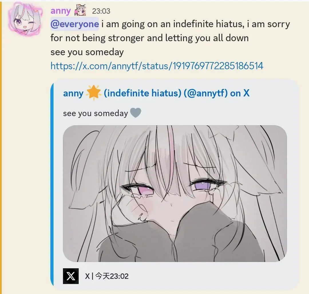 Anny要停止活动了,而且从这一年反反复复的隐身和重开来看,未来能回归的概率不大。Neuro的前三年有很多梦幻的展开,Anny也是缔造个故事的主角之一,但梦醒终将要面对现实中的焦头烂额。上个月轰轰烈烈的Sinder风波后,独立Vtuber这个原本充满诗意和童话的地方也终于迎来了自己的成年礼。Neuro宇宙能走多远,走到哪步需要做出“艰难的选择”,未来终究会见到。希望这天越远越好。