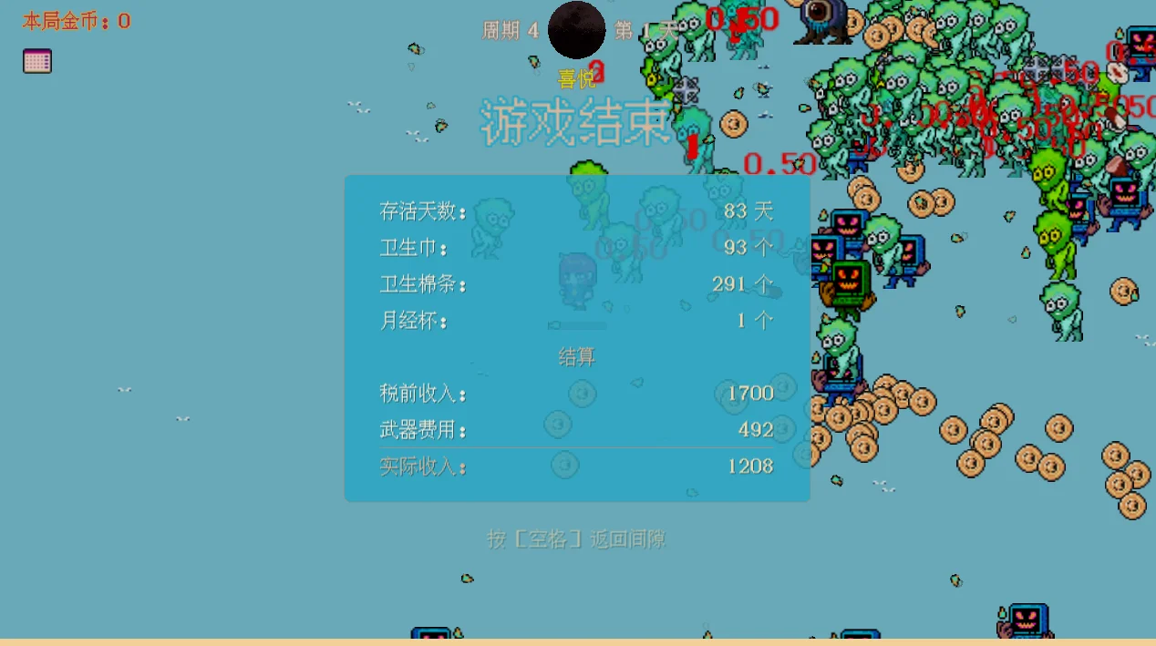 前期玩的话,基本杀不掉怪物,我懵逼的坚持了一阵子,发现有一个期滴的血可以批量杀怪,这才找到破局办法。前期没法杀怪之后,怪物会越堆越多,到几百的数量的时候,怪物就不再生成了,但是电脑也会很卡很卡,画面一顿一顿的。