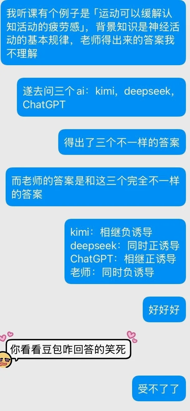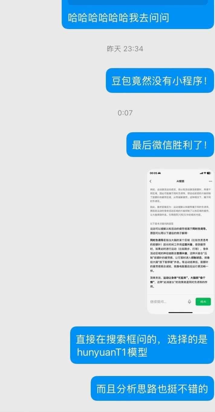 学了一个半小时左右,期间有个知识点不理解(不太认同老师解释的角度)遂问了三个人工智能,结果得出了三个不一样的答案,而且还没一个是和老师一样的。属于是选择题四个选项一人选了一个哈哈哈哈最后试了一下微信搜索框带的模型,感觉它还不错