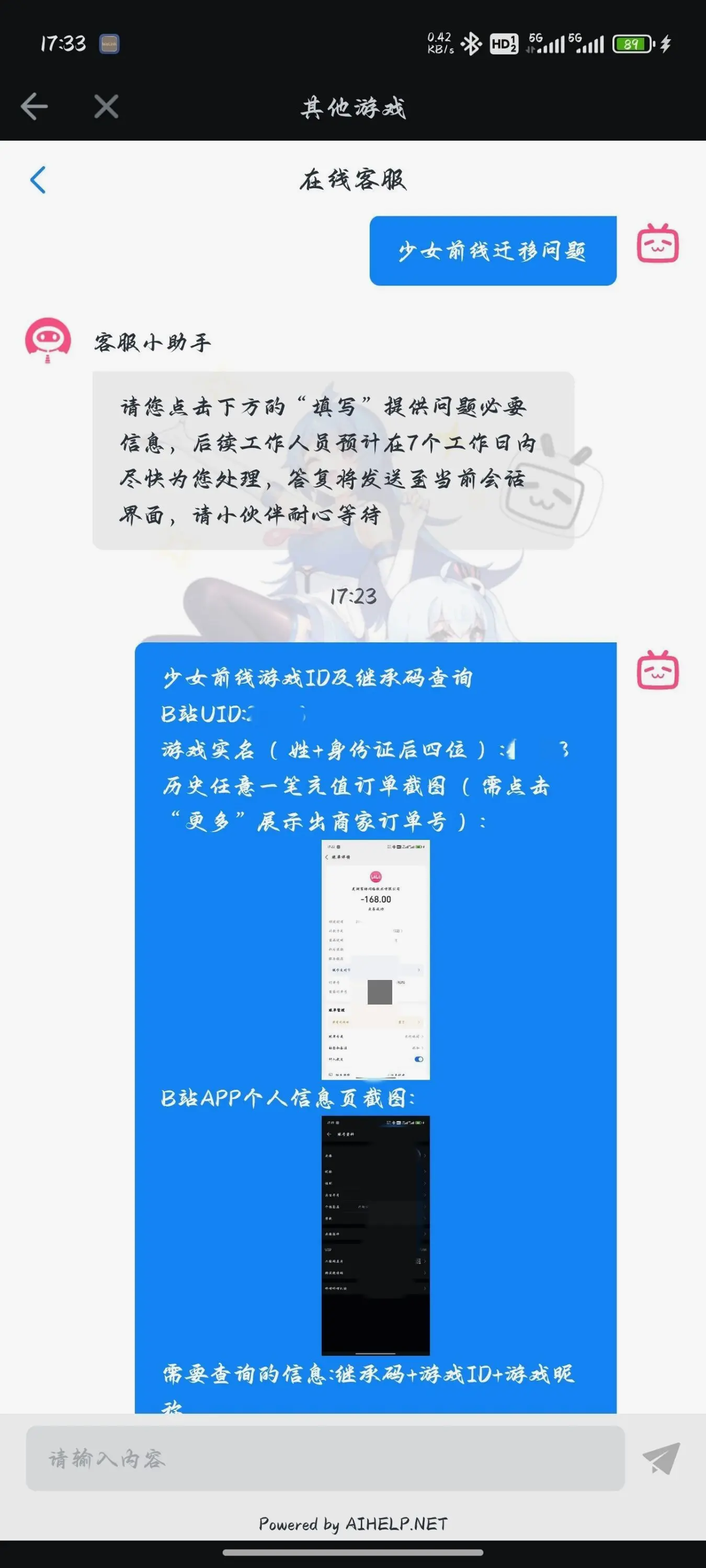 B服少前1如果没有及时进游戏看继承码和UID可以直接找B站游戏平台客服填个表单。
