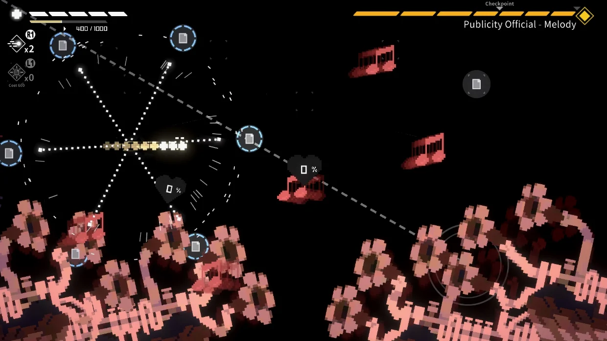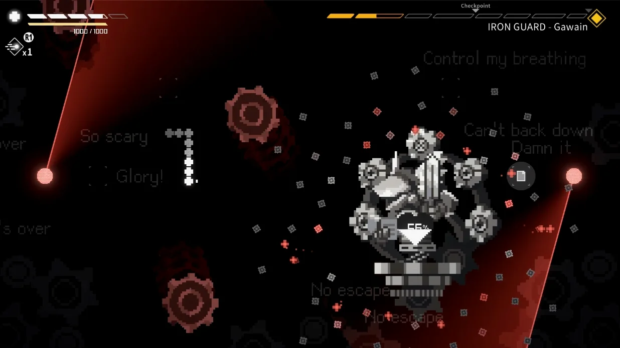 一部分游戏里有必然出现的红色物体、包含墙壁、剑、发射物等弹幕内容,需要你在其中快速躲避,同时收集可以资源,然后发动攻击。