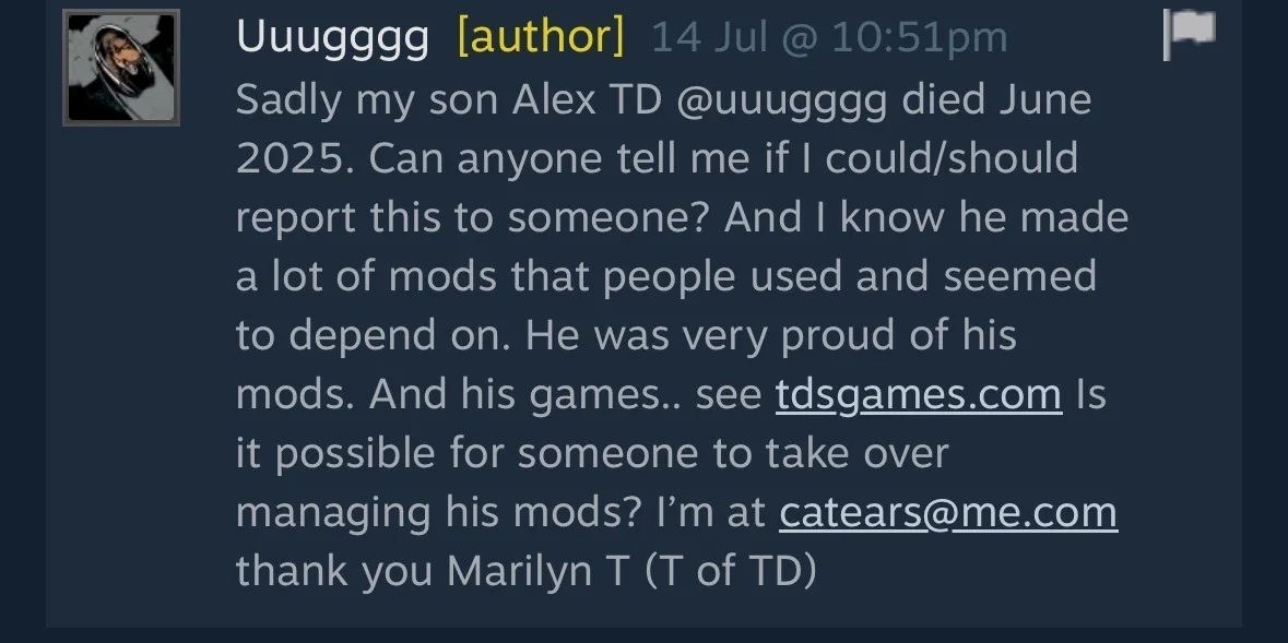 Rimworld一个重要Mod作者Uuugggg在游戏更新奥德赛之前一个月去世了。
