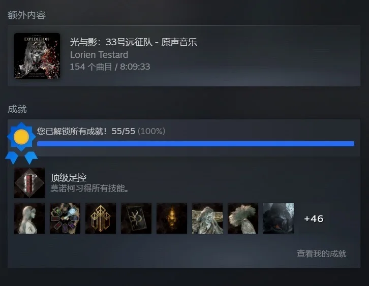 光与影33号远征队终于到达了白金成就。其实整款游戏第一周目全成就拿下来,不算很难,唯一幸运的是我一开始就买了钥匙,所以没有被那里卡住。