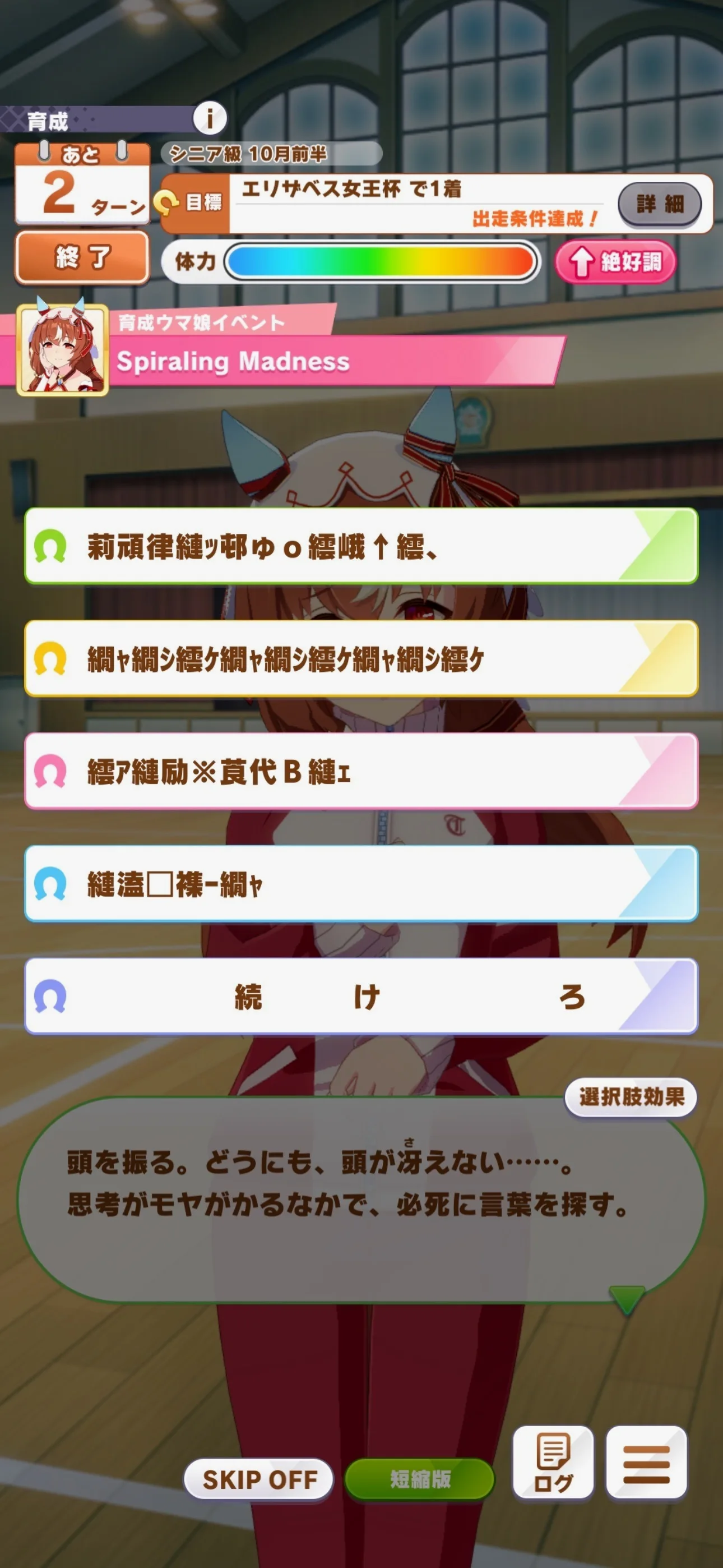 只能说《赛马娘》最近的新角色爱如往昔的故事实在是了不得,就看着变成乱码的对话选项和逐渐变暗的UI界面,不知道的还以为我在玩《月姬》呢。