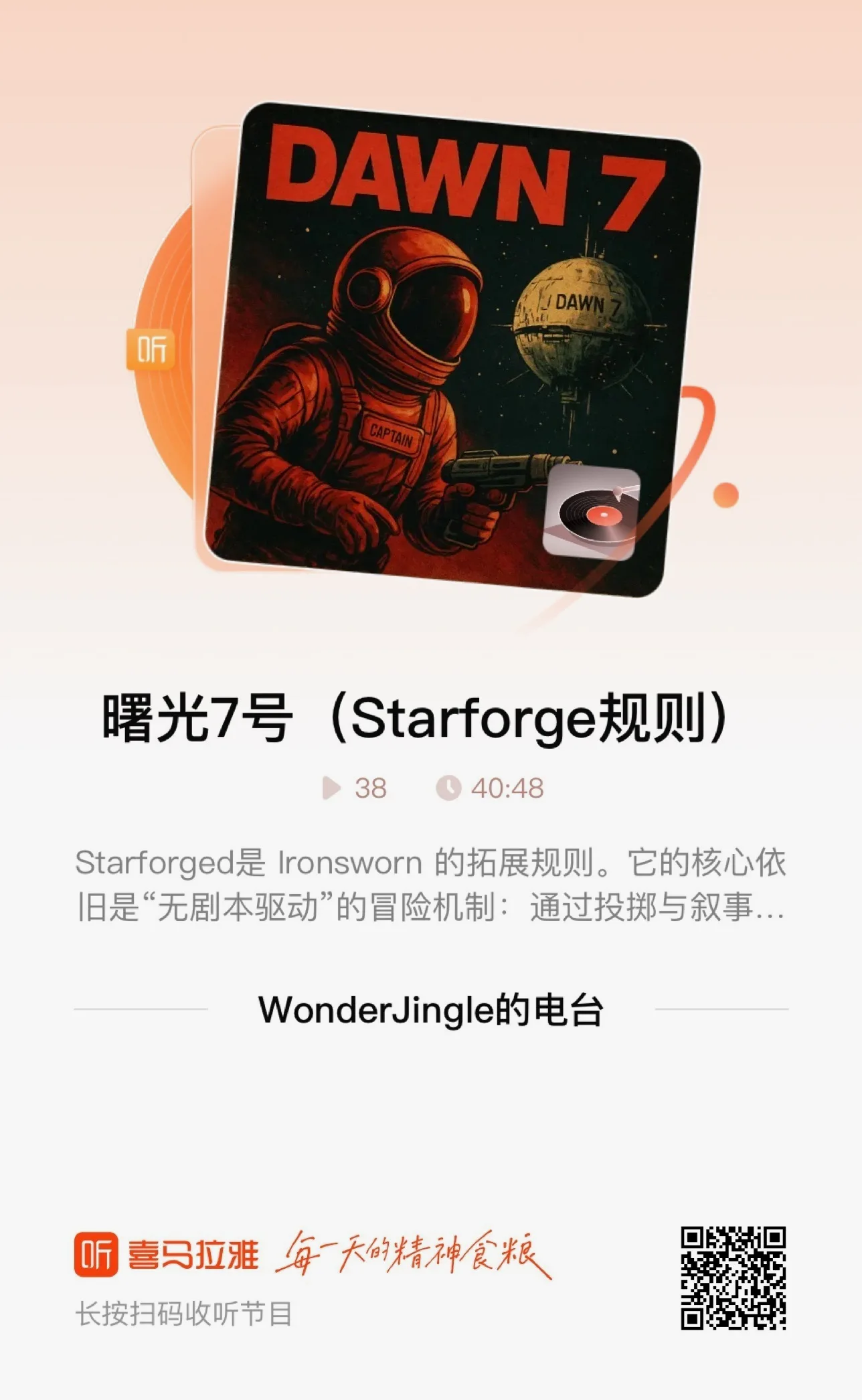 更新一期我录制的单人跑团节目!本期是对星铸规则的尝试。Starforged是 Ironsworn 的拓展规则。它的核心依旧是“无剧本驱动”的冒险机制:通过投掷与叙事,推动出不可预知的故事。规则简洁,但指向丰富,既像一款 TTRPG,又像一场创意写作实验。玩家可以自由决定世界观的基调——从《沙丘》式的政治阴谋,到《星球大战》式的群雄割据,甚至像万智牌一样的多元宇宙,都能套入其中。游玩体验近似类 Rogue 的过程:没有固定答案,每次都可能走向不同的命运。