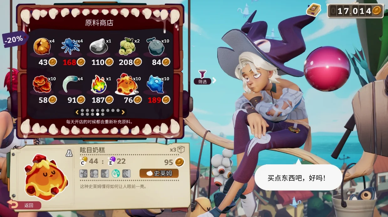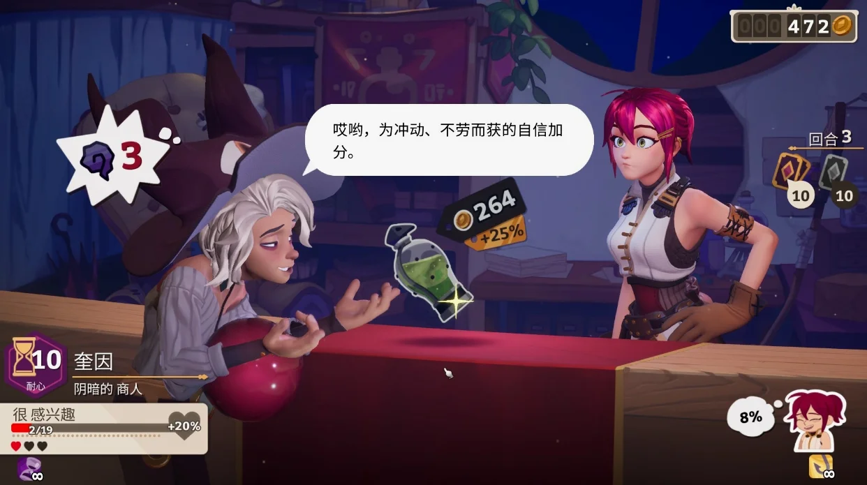而在另一部分也就是商店的经营方面,基于买卖道具为蓝本的卡牌对战游戏也十分有趣。玩家需要在有限的回合中,通过使用提前构建好的手牌来提升所售卖物品的价值,从而获取更多的利益来偿还债务,简单来说就是给《杀戮尖塔》套上了各种推销话术,目标由物质上战胜敌人转变为攻破顾客的心里防线,把物品卖出高价并尽量保证交易成功。顾客只需要负责掏钱,玩家要考虑的及很多了,保证回合够用,保持自己的压力在一个较低的范围,尽可能的抬高价位·······相较于《杀戮尖塔》手牌获取的随机性,《魔药经济学》允许玩家提前构筑好自己的“强力”牌组,合理科学地分配不同的卡位,保证运转流畅不卡手。
