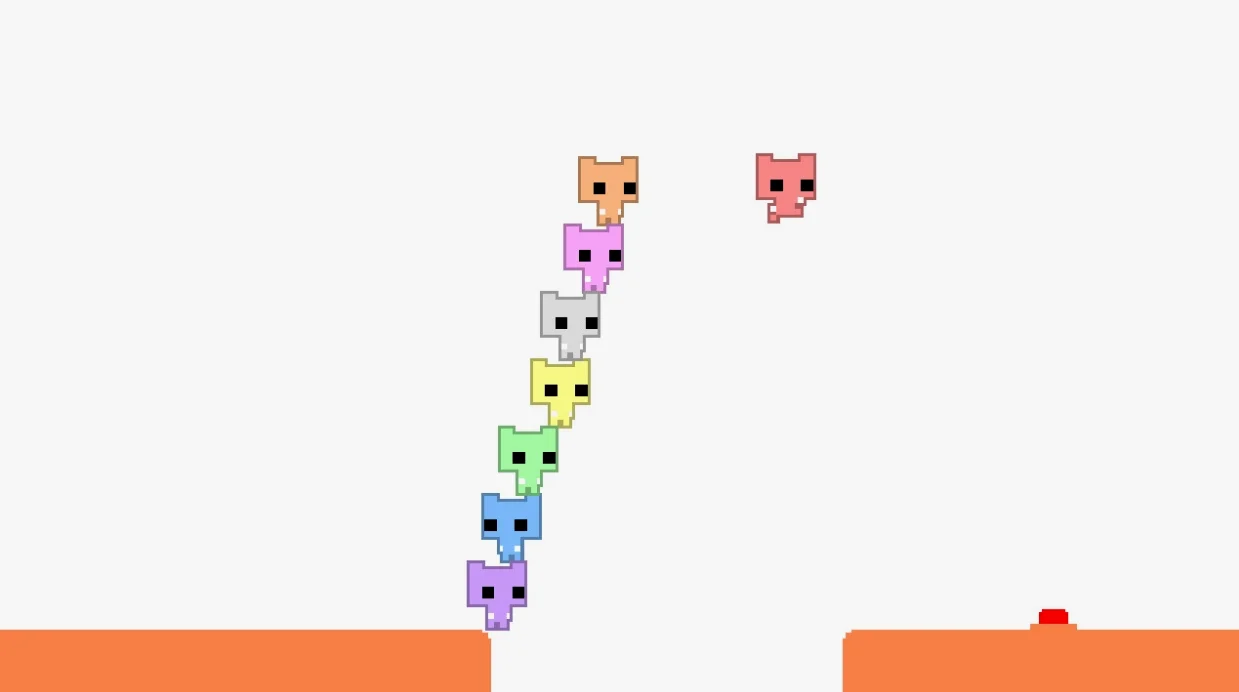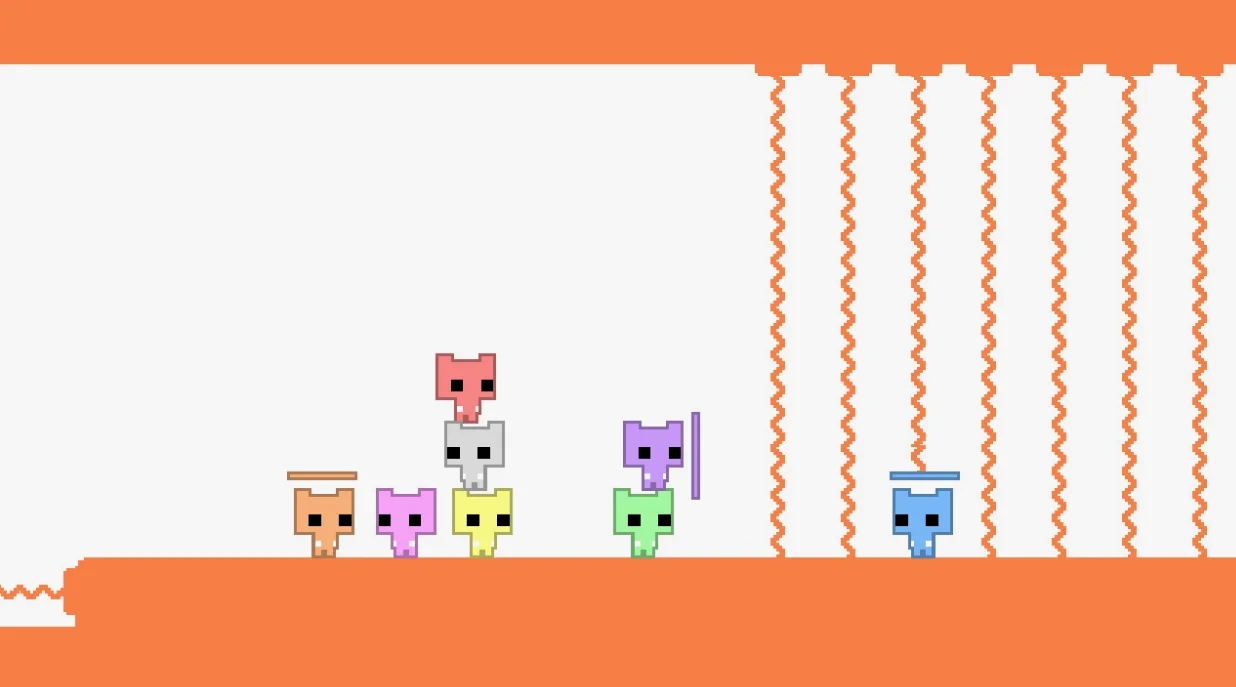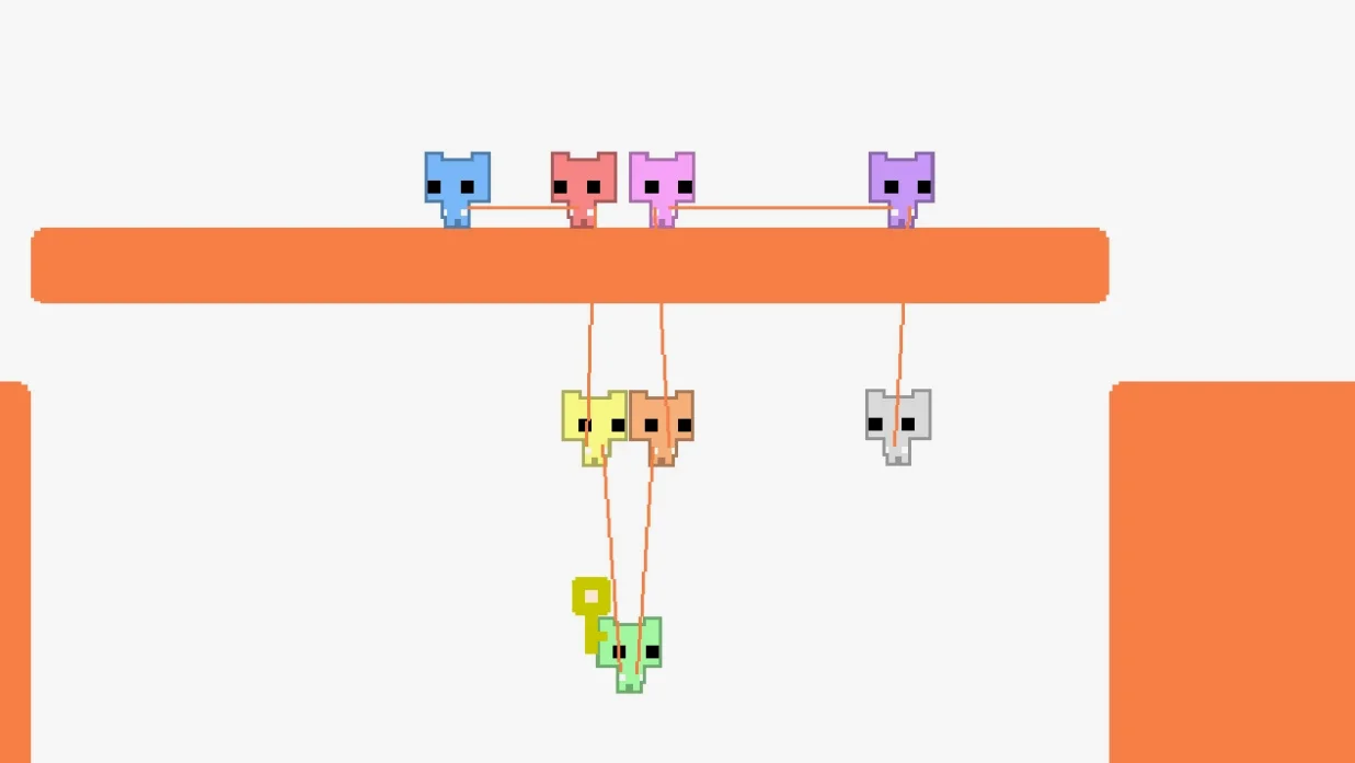 《PICO PARK》的视觉语言纯粹到近乎挑衅:基础原色的方块代表玩家,黄色方块是钥匙,红色方块为门锁,橙色平台可移动——所有交互元素仅用最基础的色彩和最常见的方块来定义。