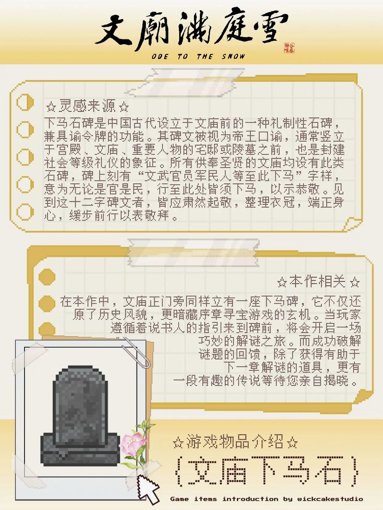 在《文庙满庭雪》中,玩家将通过收集各类道具与线索,逐步沉浸于游戏的情节发展。本次为大家介绍的是序章中的关键提示物品——文庙下马石。