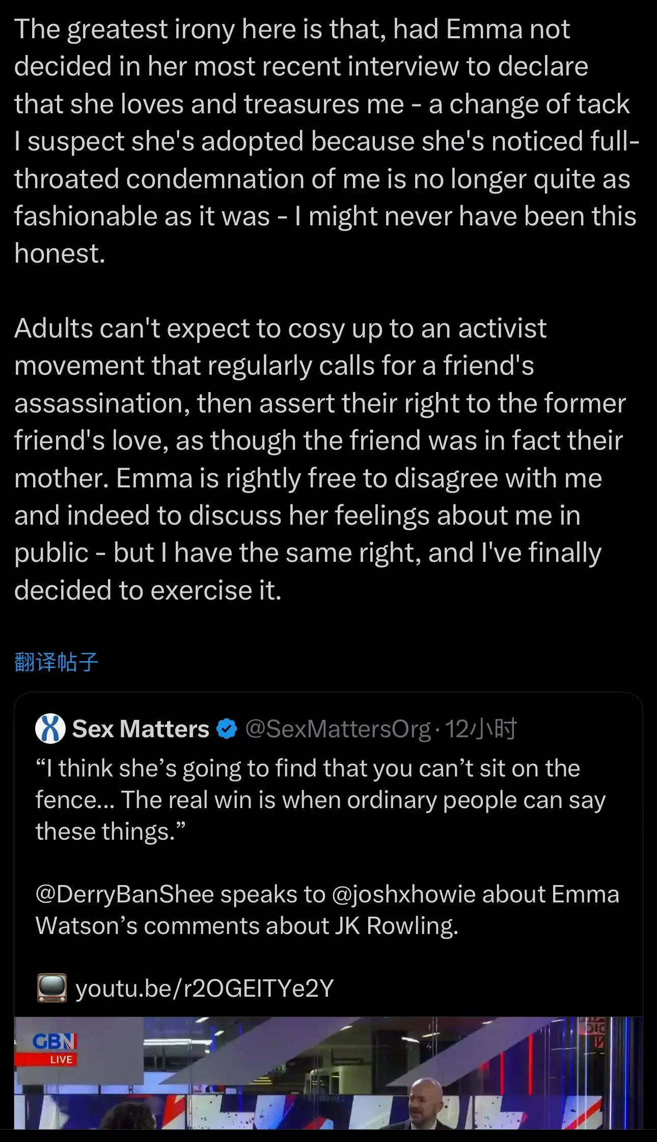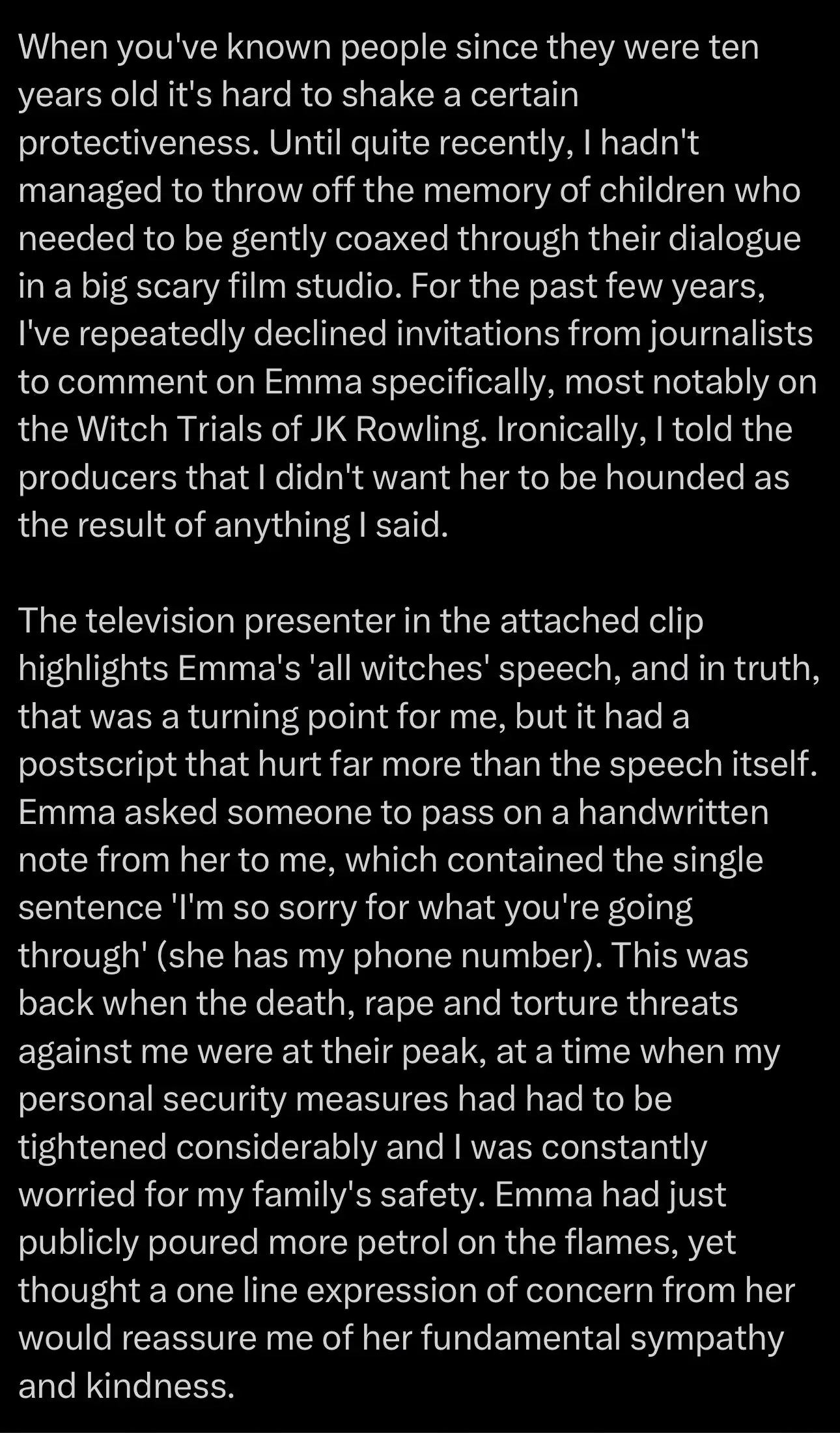 我转发的视频中那位电视主持人着重提及艾玛的"所有女巫"演说(2022年颁奖礼上她说自己代表“所有的女巫们”),那对我来说确实是转折点,但后续发展远比演说本身更令我刺痛。艾玛托人转交我一张手写字条,仅写着"对于您正经历的困境我深感抱歉"(其实她有我的手机号)。那时针对我的死亡威胁、强奸恐吓与酷刑诅咒正值巅峰,我不得不大幅升级安保措施,终日为家人安危忧心忡忡。艾玛刚在公众舆论上浇完汽油,却以为这行轻飘飘的文字能让我相信她骨子里的善意。
