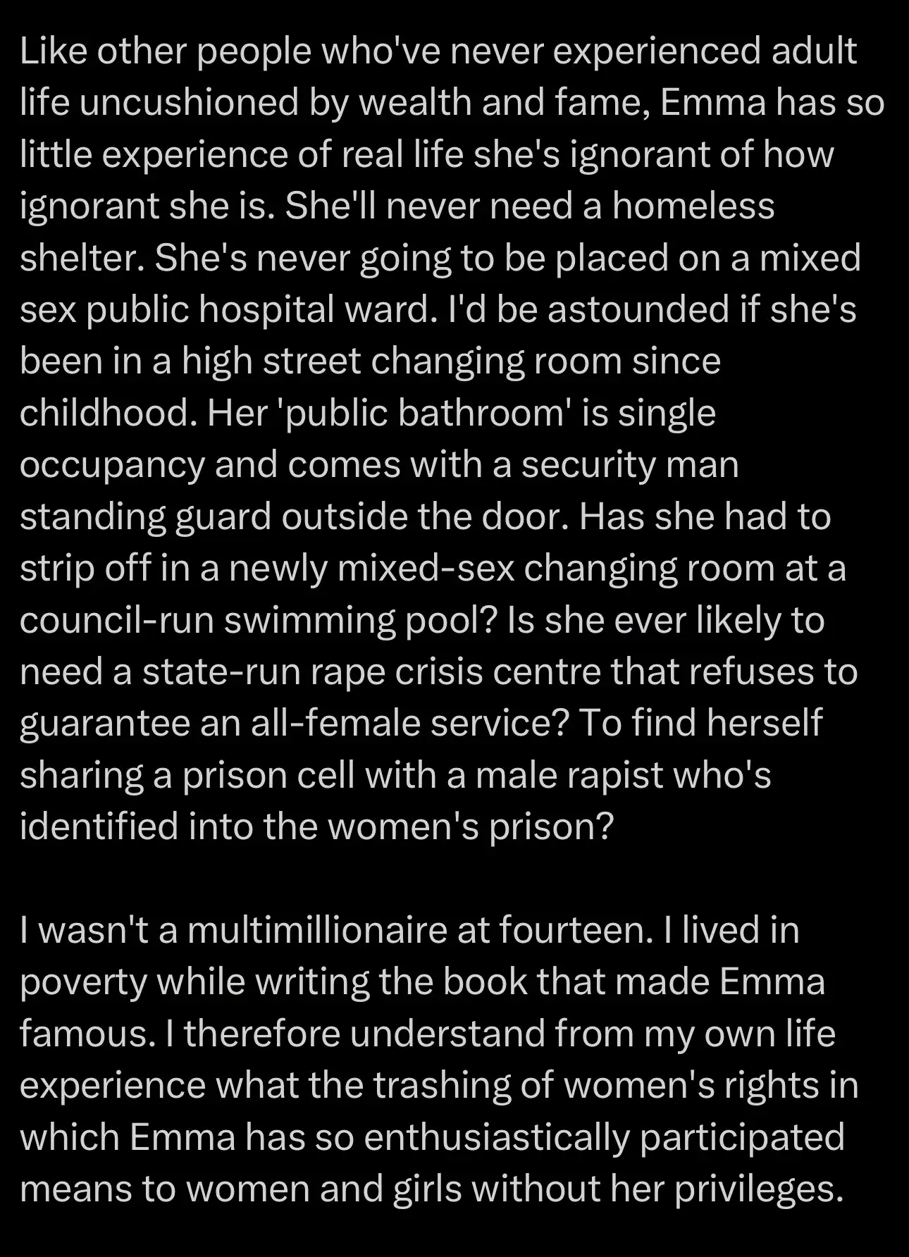 与那些始终被财富盛名包裹而未曾经历真实人生的幸运儿相同,艾玛对现实世界的认知贫瘠到无法自知其贫瘠。她永不需要栖身收容所,绝不会被安置在混合性别的公立医院病房,我甚至怀疑她成年后是否进过商业街的公共更衣室——她的"公共洗手间"是单人专用,门外还站着保安。她可能会在市政泳池新改制的混性别更衣间脱光衣服吗?她可能会去找无法保障纯女性服务的公立强奸救助中心吗?她可能会跟自我认同为女性的男性强奸犯共居囚室吗?