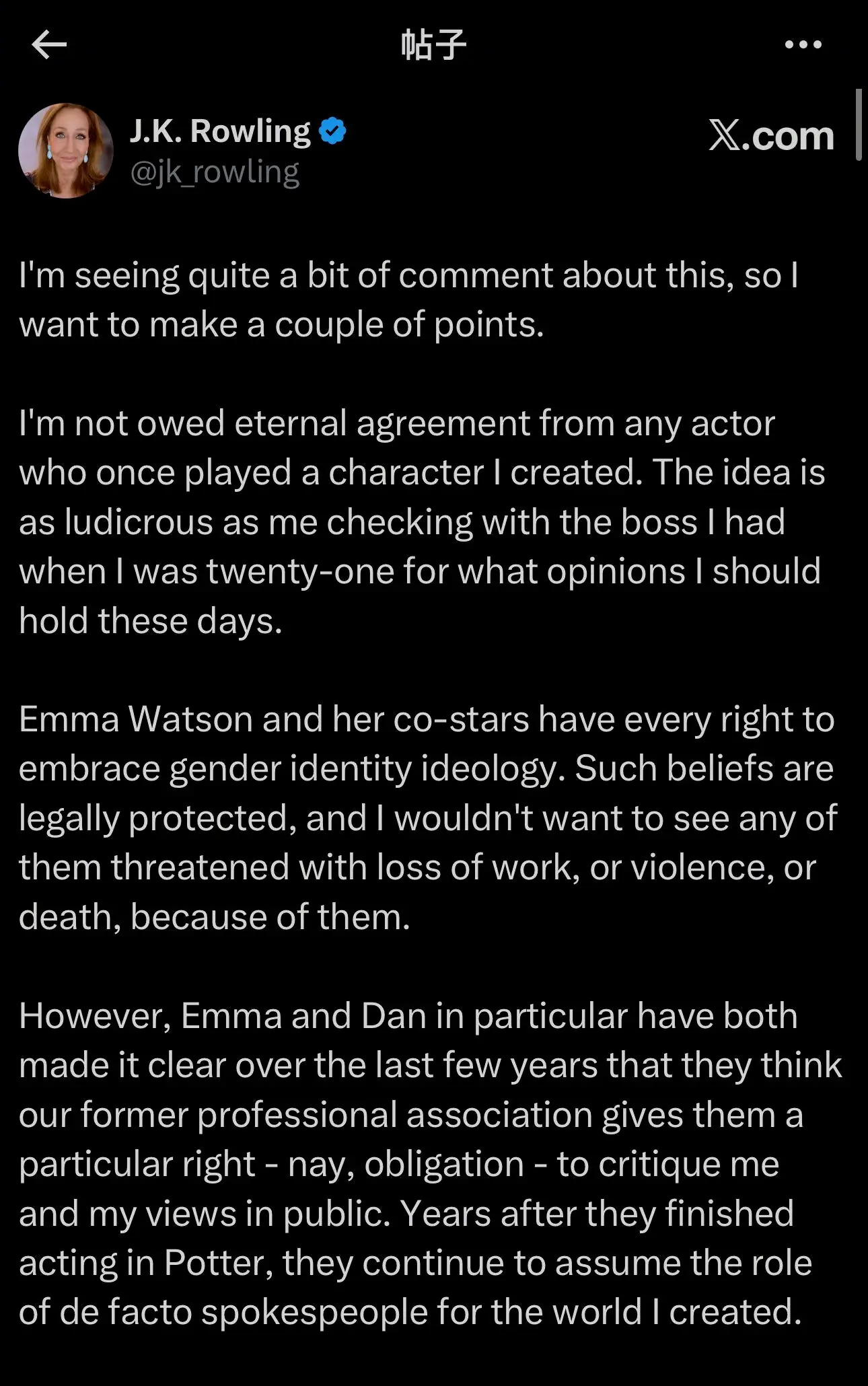 任何曾饰演过我笔下角色的演员,都无需对我永远认同。这种想法荒谬至极,好比如今我仍要向我21岁时的上司请示我该持何种观点一样。艾玛·沃特森及其搭档演员们完全有权拥抱性别认同理念——这些信念受法律保护,我绝不希望任何人因理念差异面临失业威胁、暴力侵袭甚至生命危险。