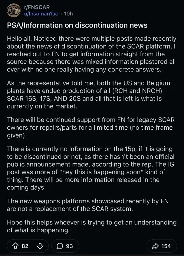 本周,在社交媒体上,当被问及有关整个 SCAR 系列停产的传言是否属实时,该公司官方 X 页面回应道:“没错。我们刚刚完成了传统 FN SCAR 系列的生产。现在市场上的都是最后一批了。如果你一直想要一把,现在是时候了。” 随后,该公司又补充道:“美国对传统 SCAR 16S、17S 和 20S 的生产已经完成。不会再生产了。”