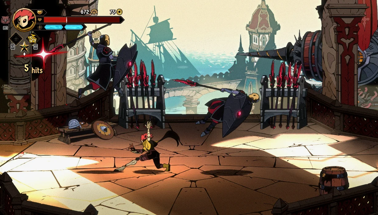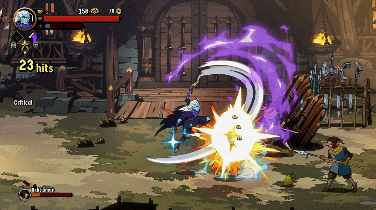 游戏将冲刺和防御进行了结合,每当敌人攻击前玩家对着攻击方向直冲便能起到精准格挡的效果,而上下冲刺则是横版动作游戏独特的Y轴上的闪避。除此之外,玩家还能通过重攻击、技能与敌人的攻击硬碰硬进行对冲效果,游戏将其称为“交锋”,不过,交锋相较精准格挡更加的困难,角色较为明显的技能动作前后摇和短的判定时间让交锋实际上风险要高于收益,虽然如果能不经意间用起来的确很帅
