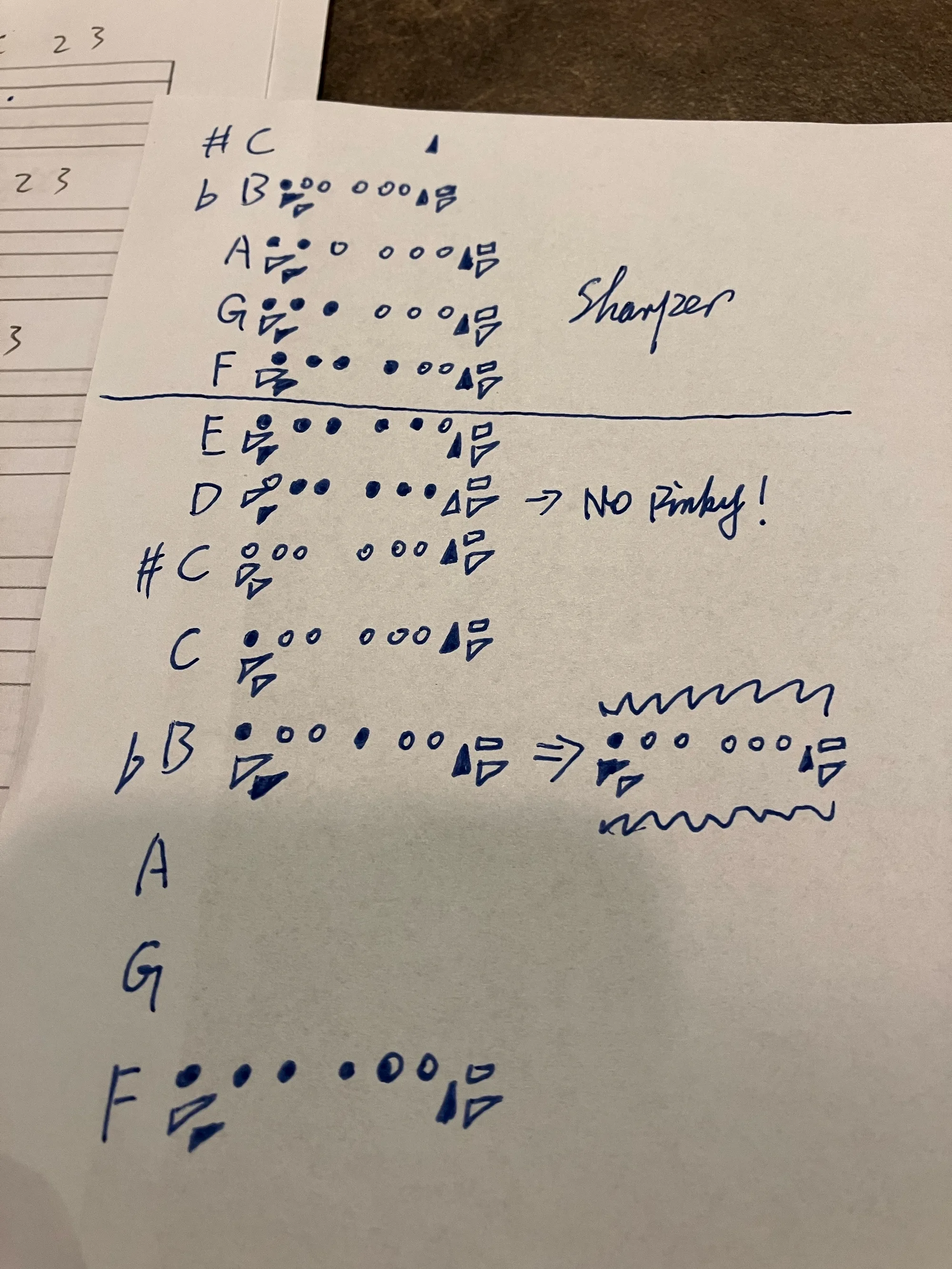 从键盘上摸出调子到写成长笛能操作的谱子还有很多东西可以玩。比如这个指法,有些地方为了提前准备,可以把手指提前准备好。最后一行G、A通常是左手拇指压下按键,但Bb用左手拇指的半音键,这个半音键会同时控制下按键且不影响G和A,就可以提前准备好(谱子上没写)。