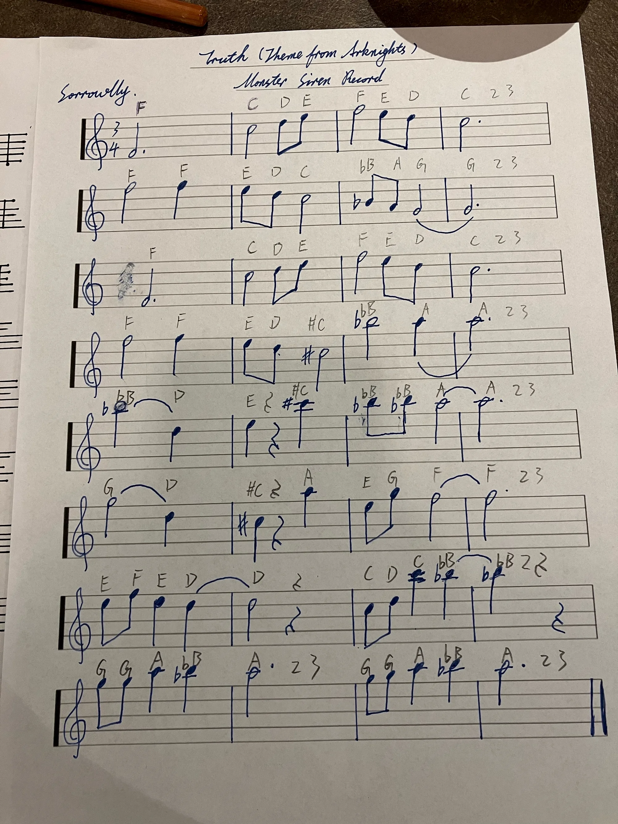 改了一版稍微清楚一点的谱子,不带歌词,留空间给标记。之前第二行抄错了,应该是F,誊写的时候抄成了E。然后就是A#改成了Bb,虽然是一回事儿,但孩子用的书里先教了Bb,就改成熟悉的而已。