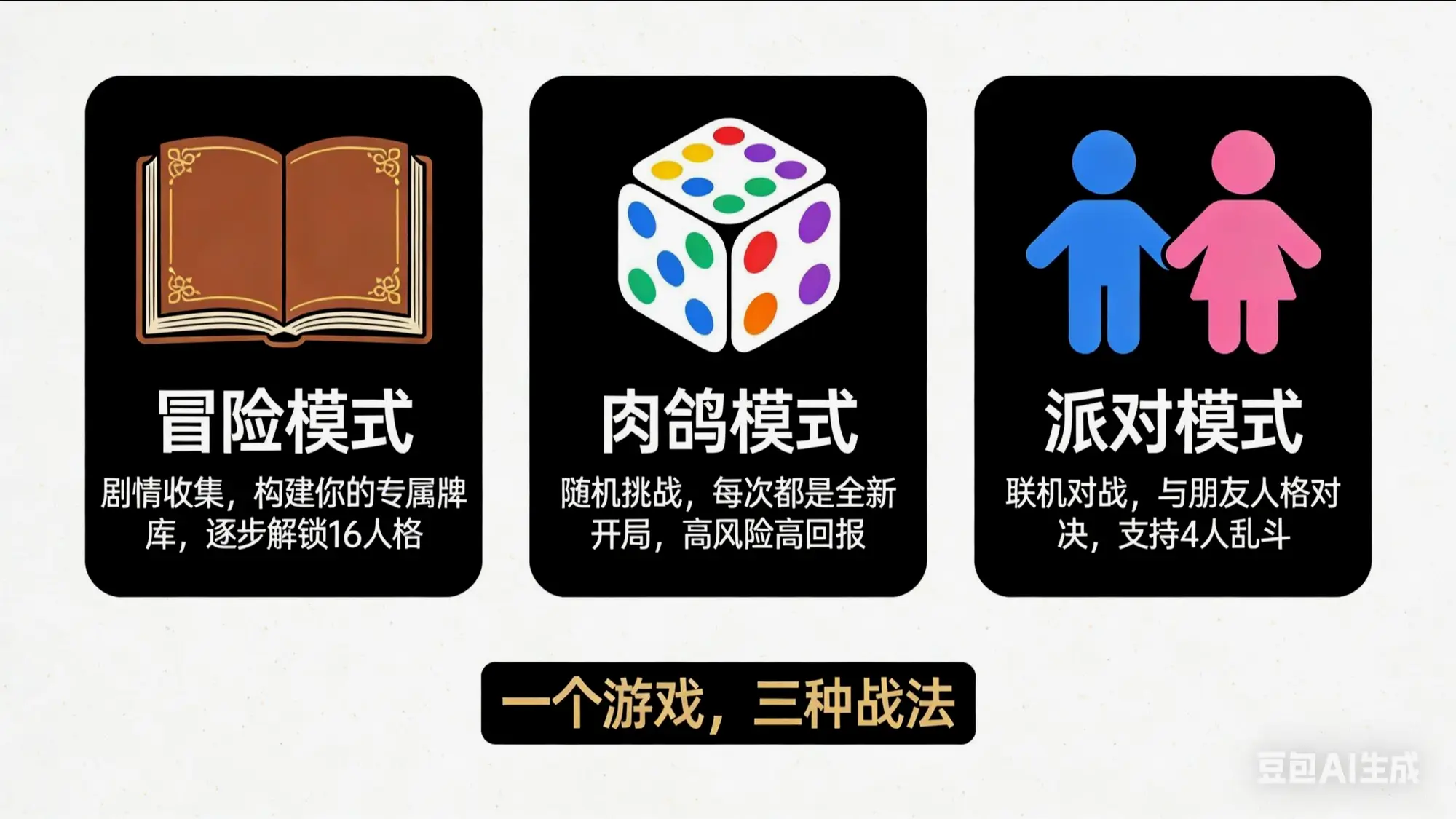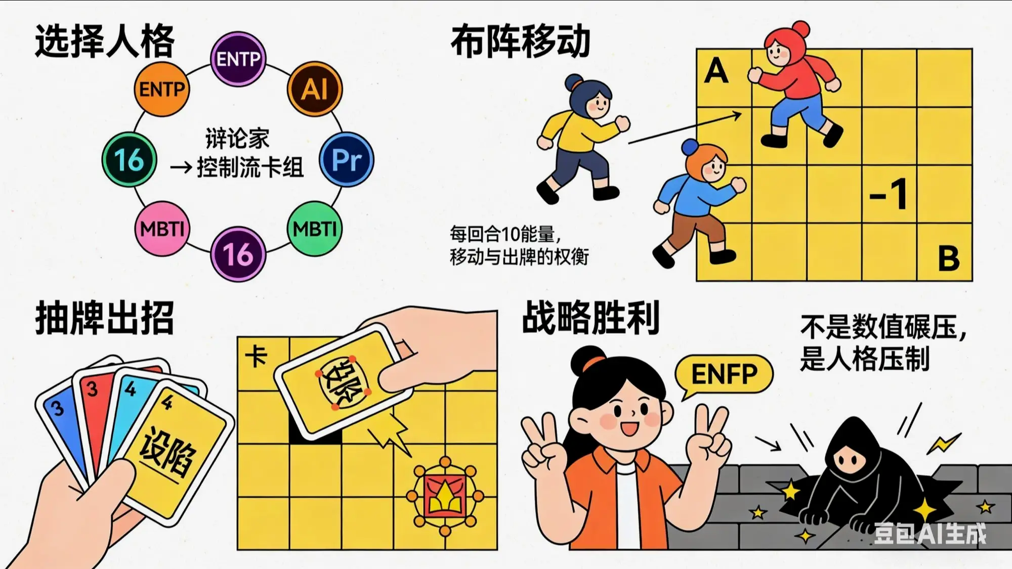 这是一款用MBTI人格打牌走格子的战术游戏。你操控不同人格角色,在六角格战场上抽牌、移动、发动技能,体验roguelike卡组构建与战棋策略的双重乐趣。