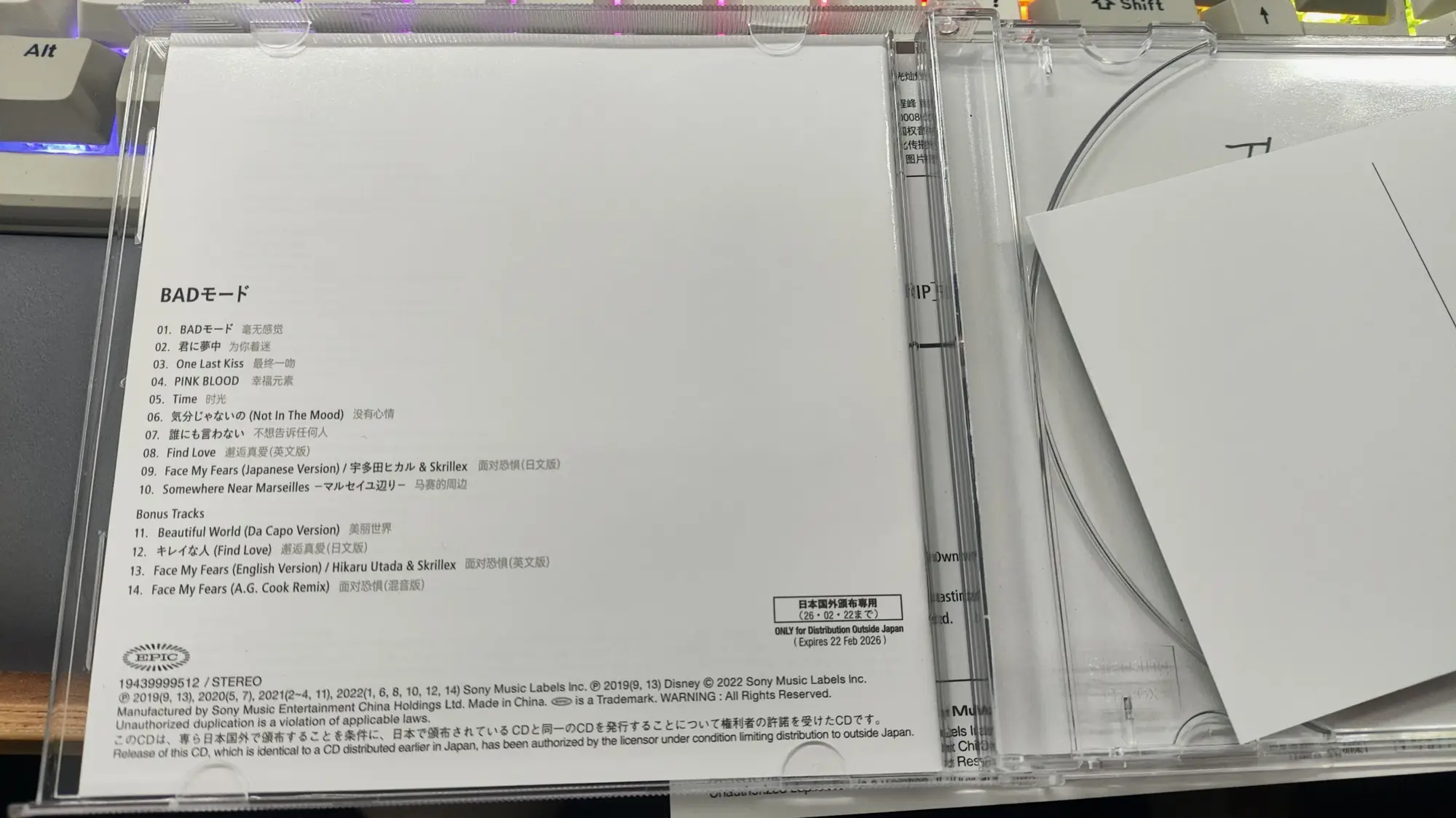 我收的这张是国行引进版,拿到手之后有个我很困惑的地方,就是一般来说,专辑CD盒子都是从右边打开的,但这张专辑却是从左边打开,而且如果说它就是想这么设计的话,那它的歌词本感觉也放反了,本来应该作为外侧展示歌曲曲目信息的底面却是在打开盒子的里侧,因为我手里没有日版原版,也不知道国行这个设计是什么情况,难道是错版吗?
