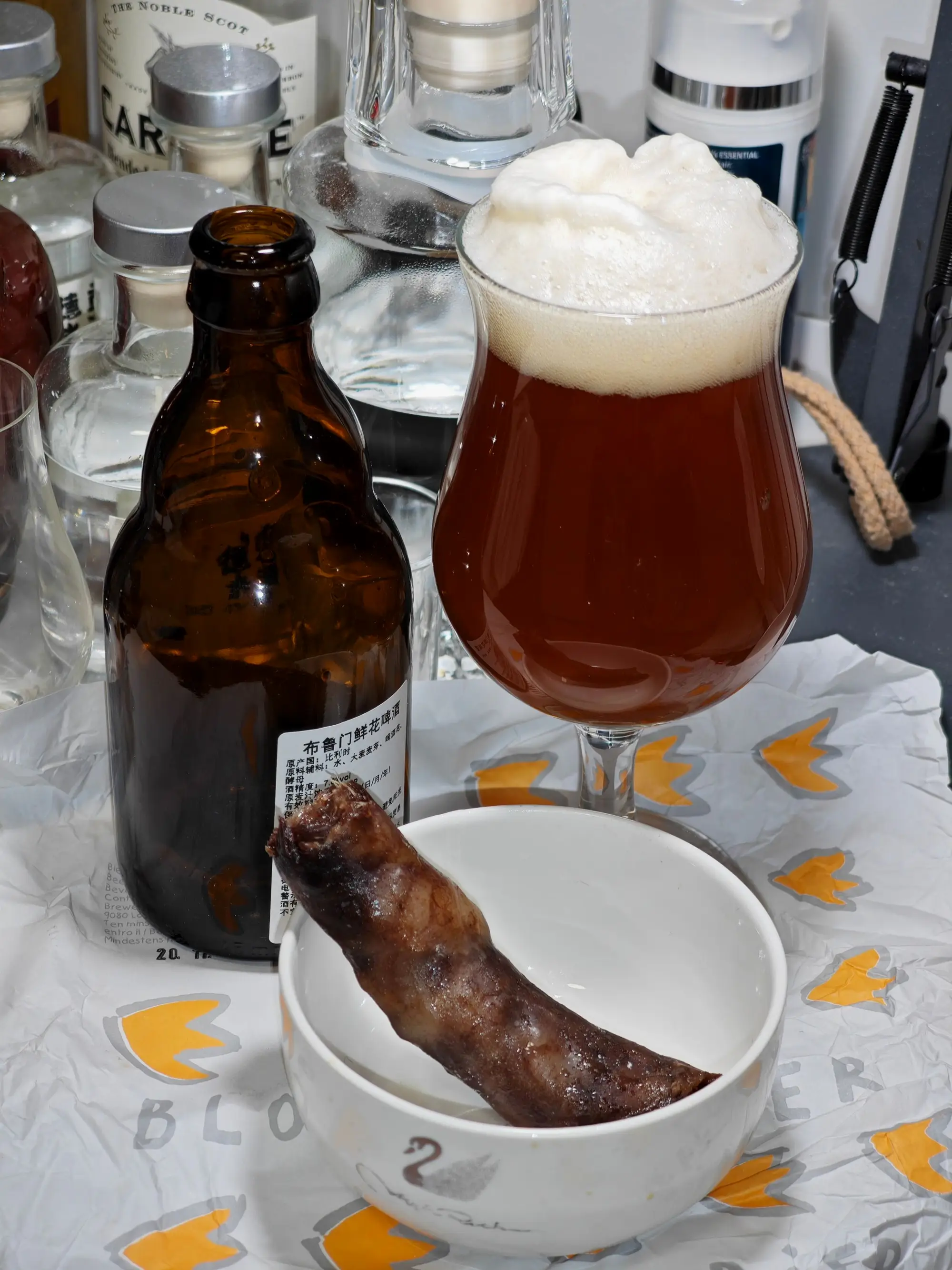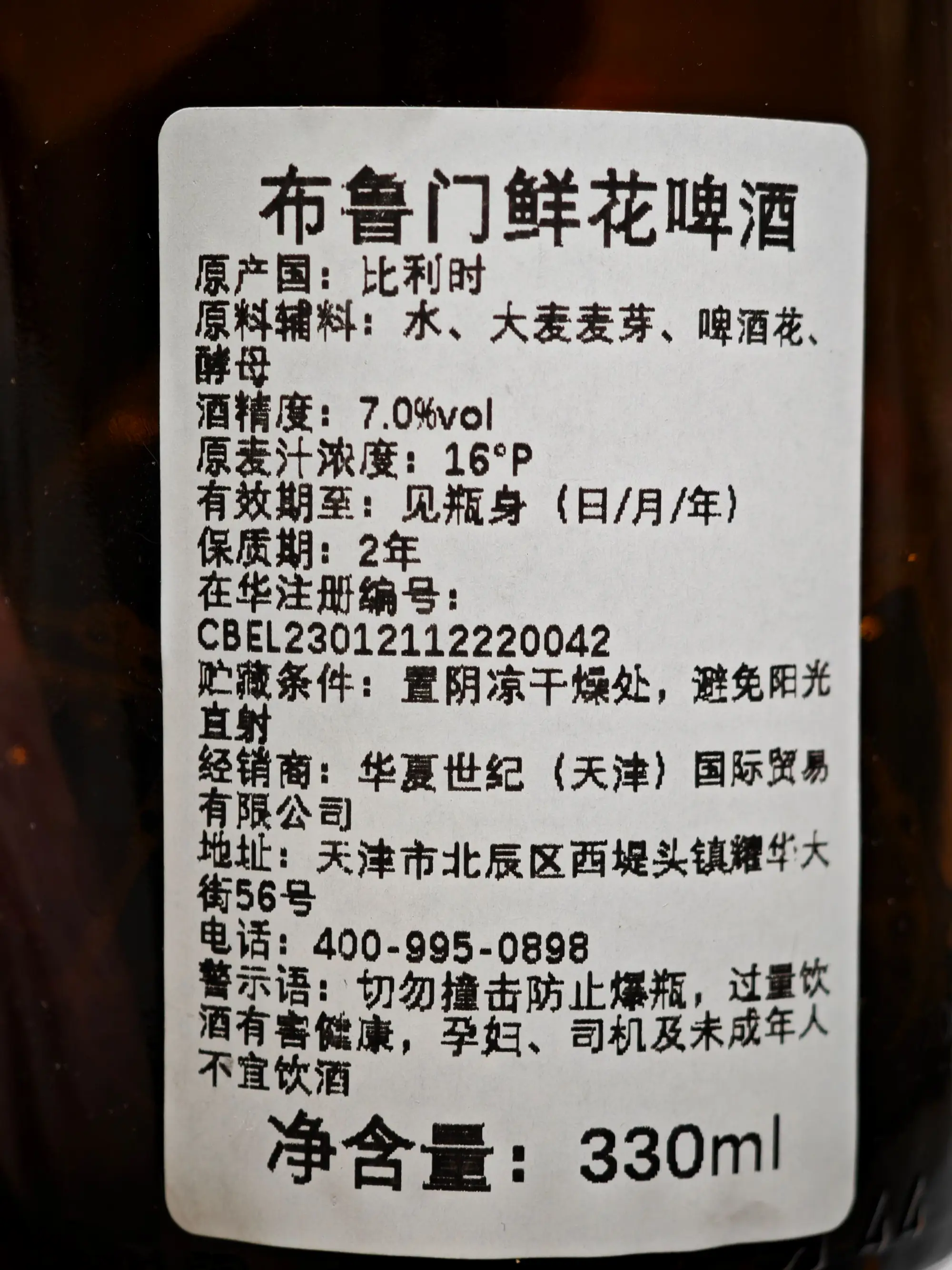 今晚是哈尔滨干肠配布鲁门鲜花啤酒。产地比利时,酒精度7%vol,原麦汁浓度16°P,原料表里没有额外增香的材料,价格15块8,330ml。