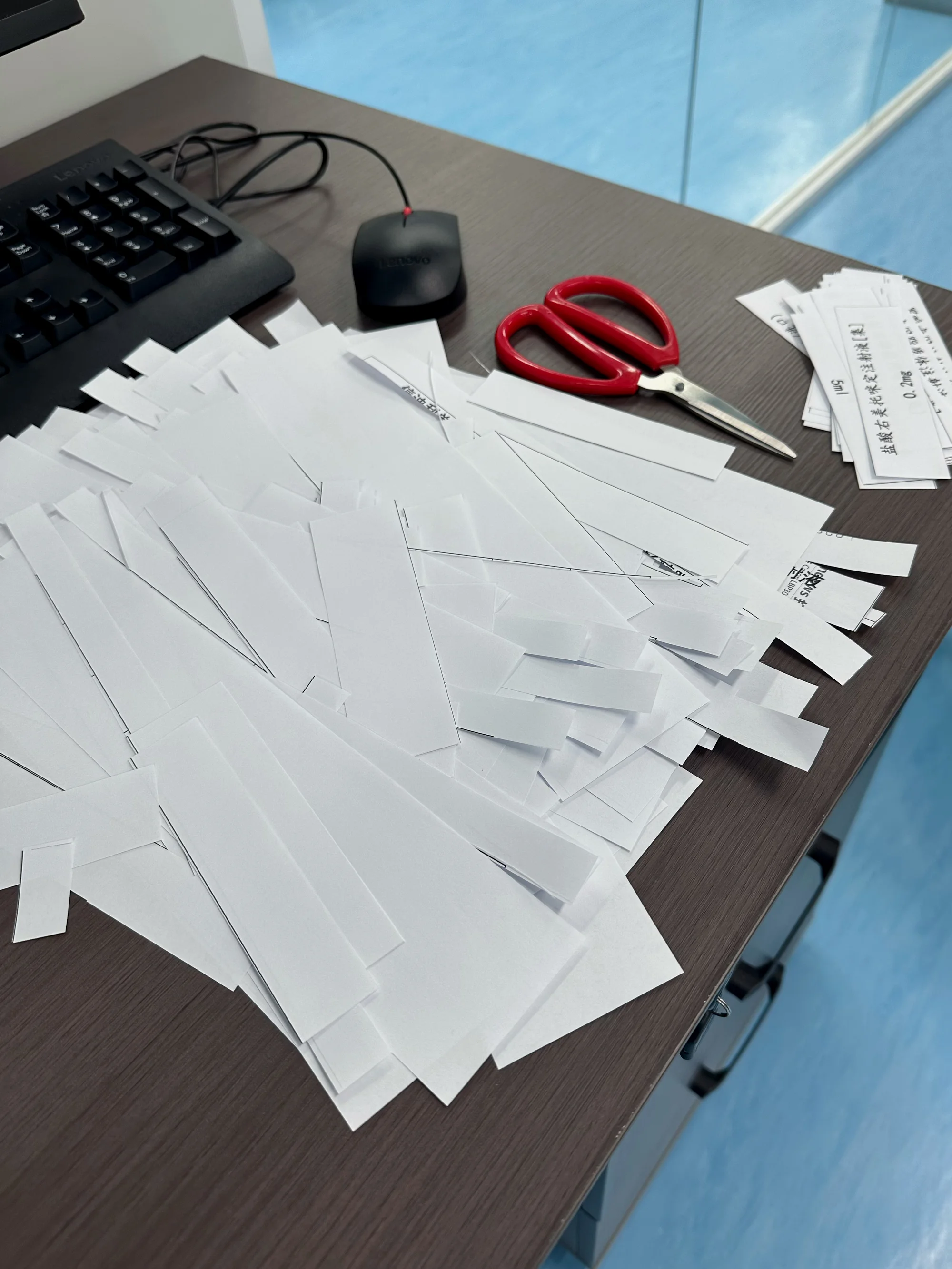换药品标签裁纸,同事路过说“纸边边给我留着,晚上打牌贴这个!”