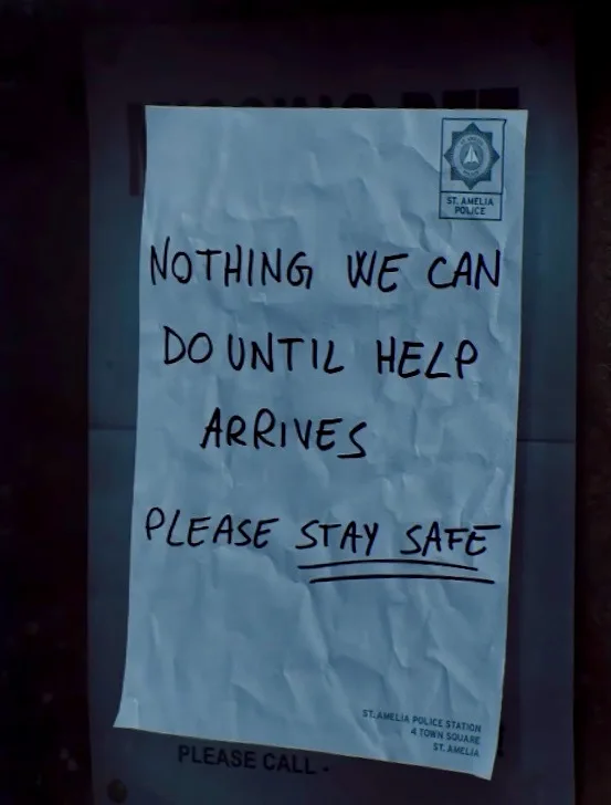“在救援到来前,我们无能为力,请保证自身安全——圣·阿梅利亚警察局,小镇广场4号”(P4)