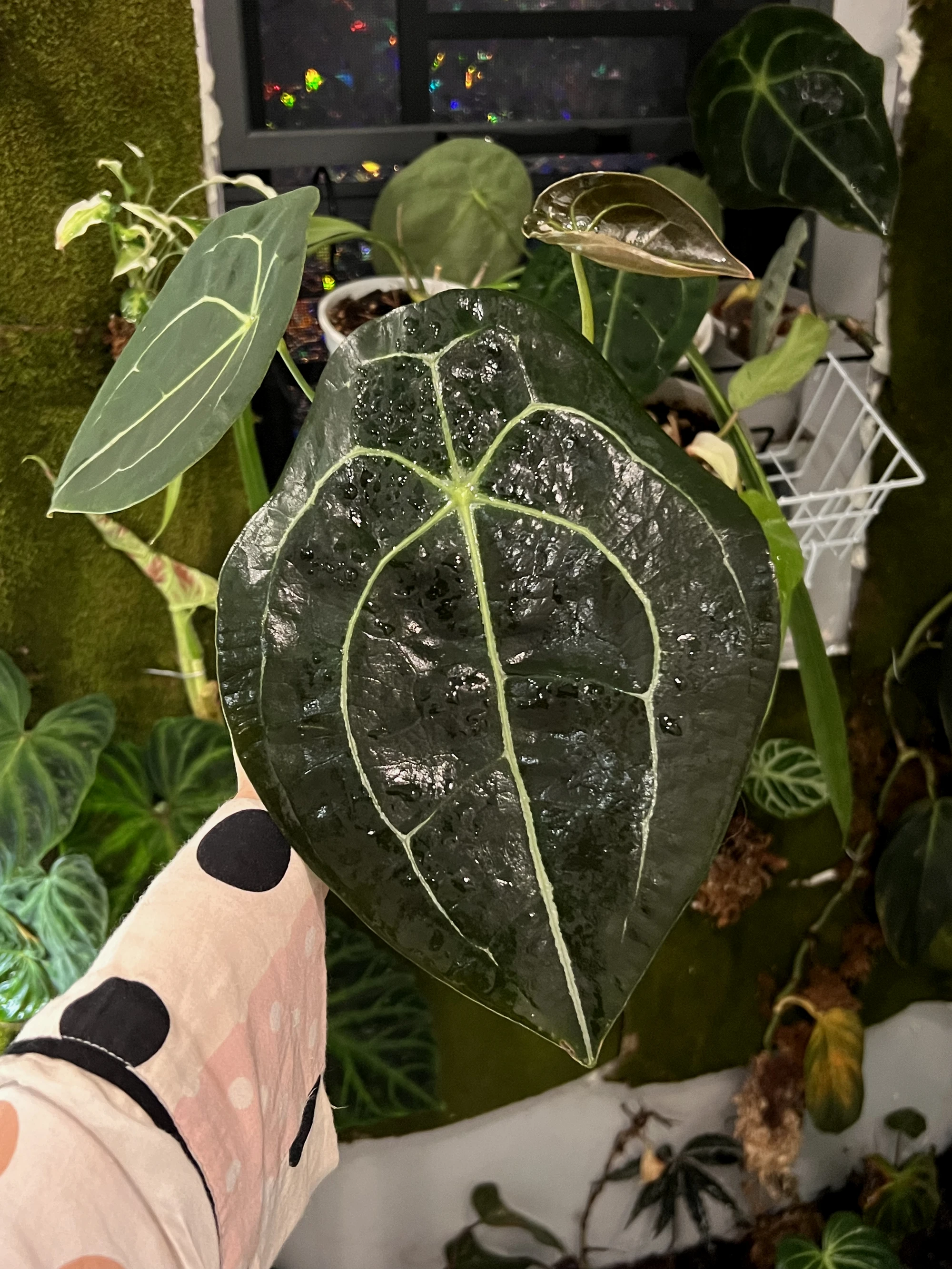 盾叶花烛。但是是水晶盾叶还是原种盾叶我也不记得了~这个蜘蛛侠一样的脉络和大黑叶子太帅了!花烛是真的难伺候,又要湿度,又要光照,它还容易僵苗,好几个月不长叶子,气skr人!