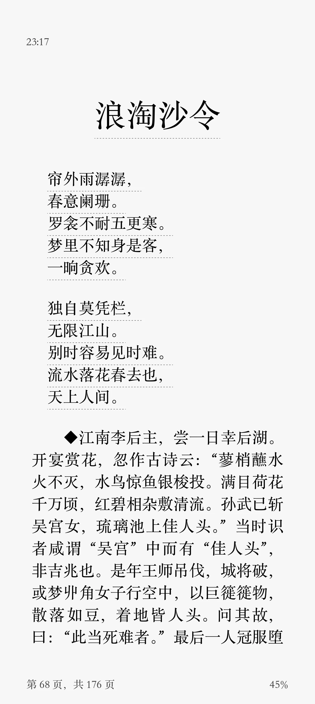 但从第三句,罗衾不耐五更寒,梦里不知身是客开始。到无限江山,别时容易见时难。再到流水落花春去(也!),天上人间。句似断非断,彼时天上,此时人间啊!落差之感油生。