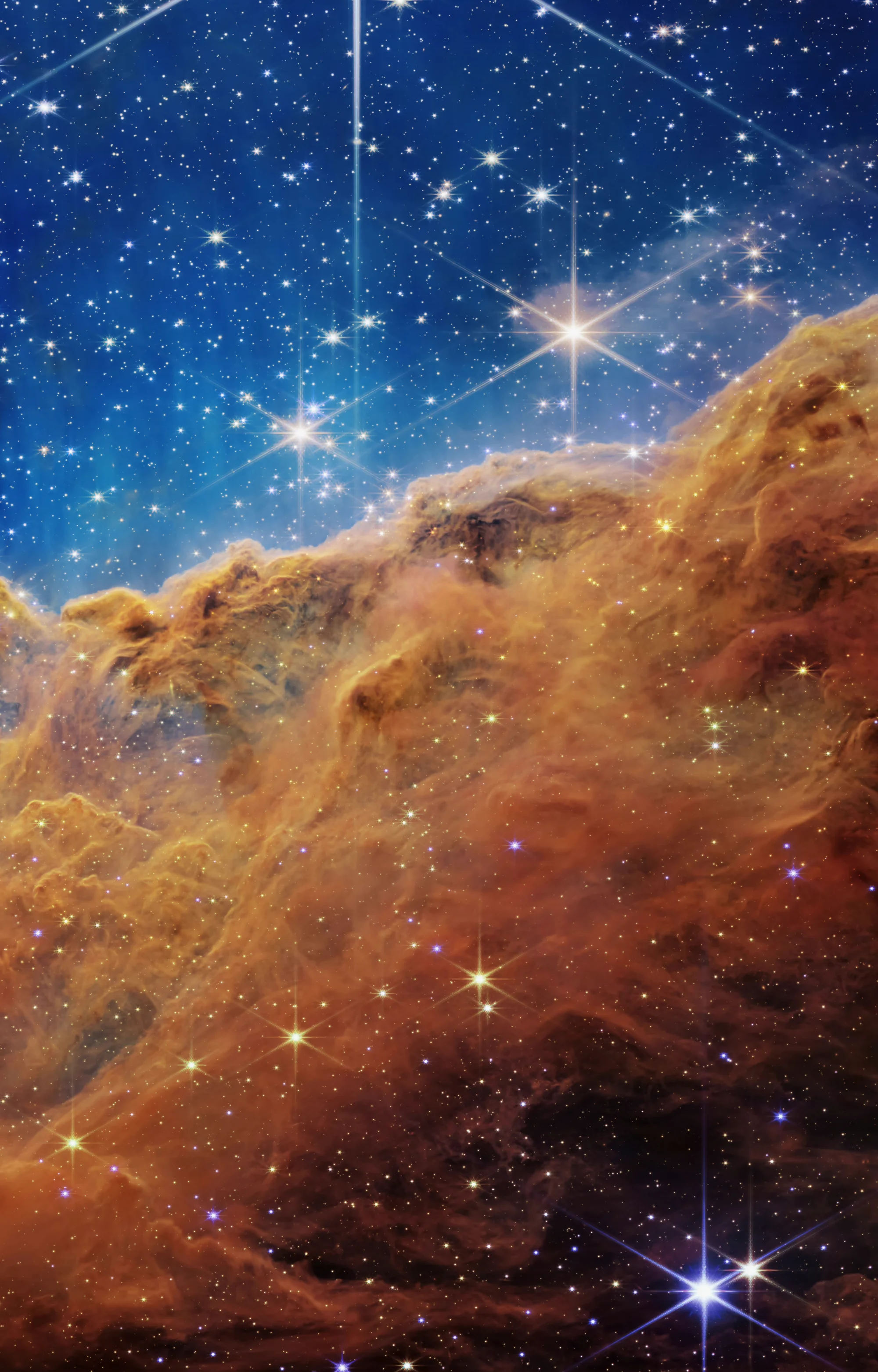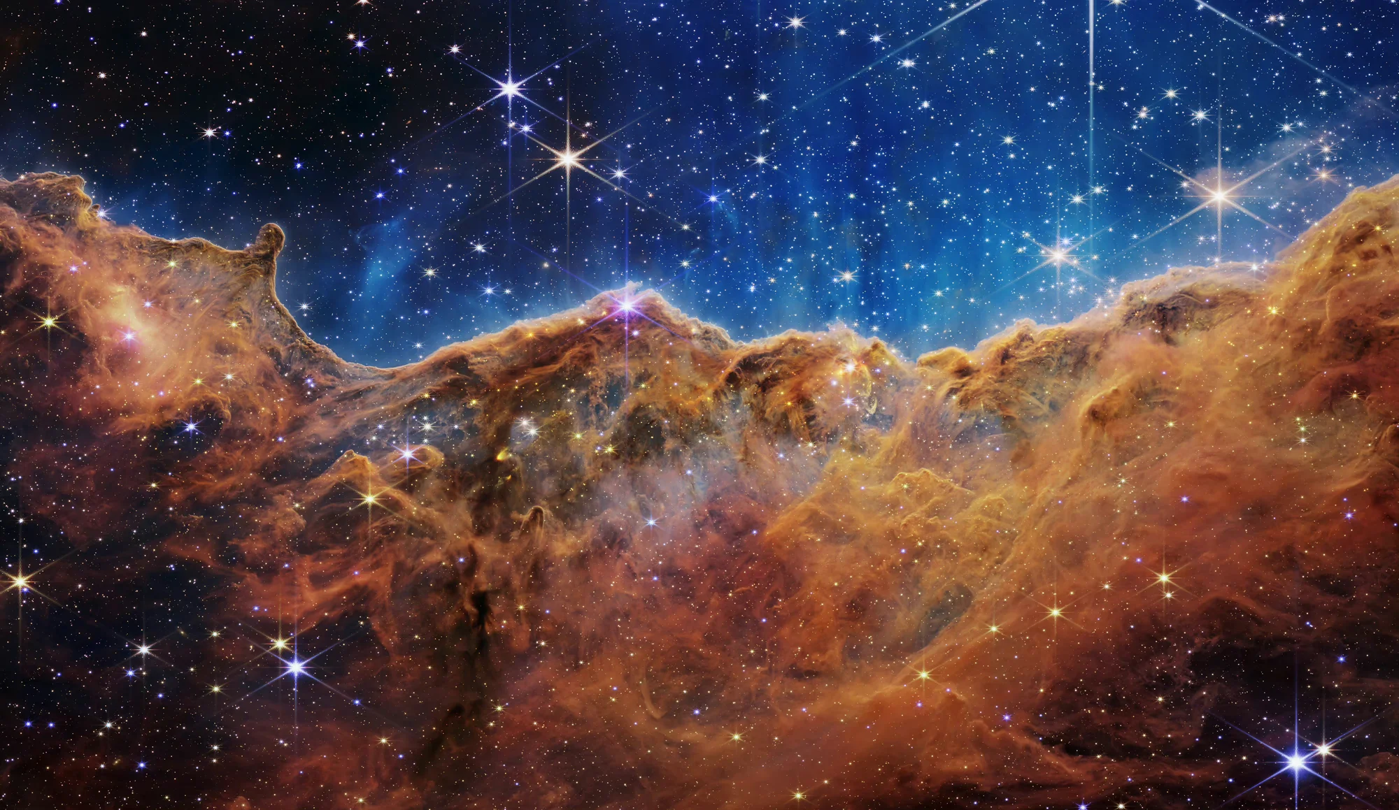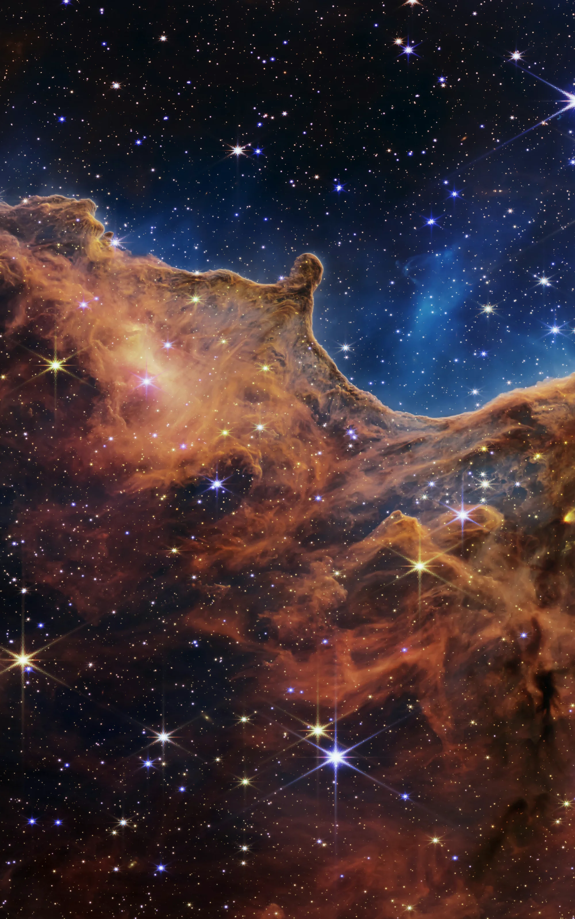 该区域被称为宇宙悬崖,实际上是 NGC 3324 内一个巨大的气腔的边缘,距离我们大约 7,600 光年。这个海绵状区域是由星云中强烈的紫外线辐射和恒星风从位于气泡中心的极大质量、炽热的年轻恒星雕刻而成的,位于该图像所示区域的上方。来自这些恒星的高能辐射正在塑造星云的壁,将其慢慢侵蚀掉。