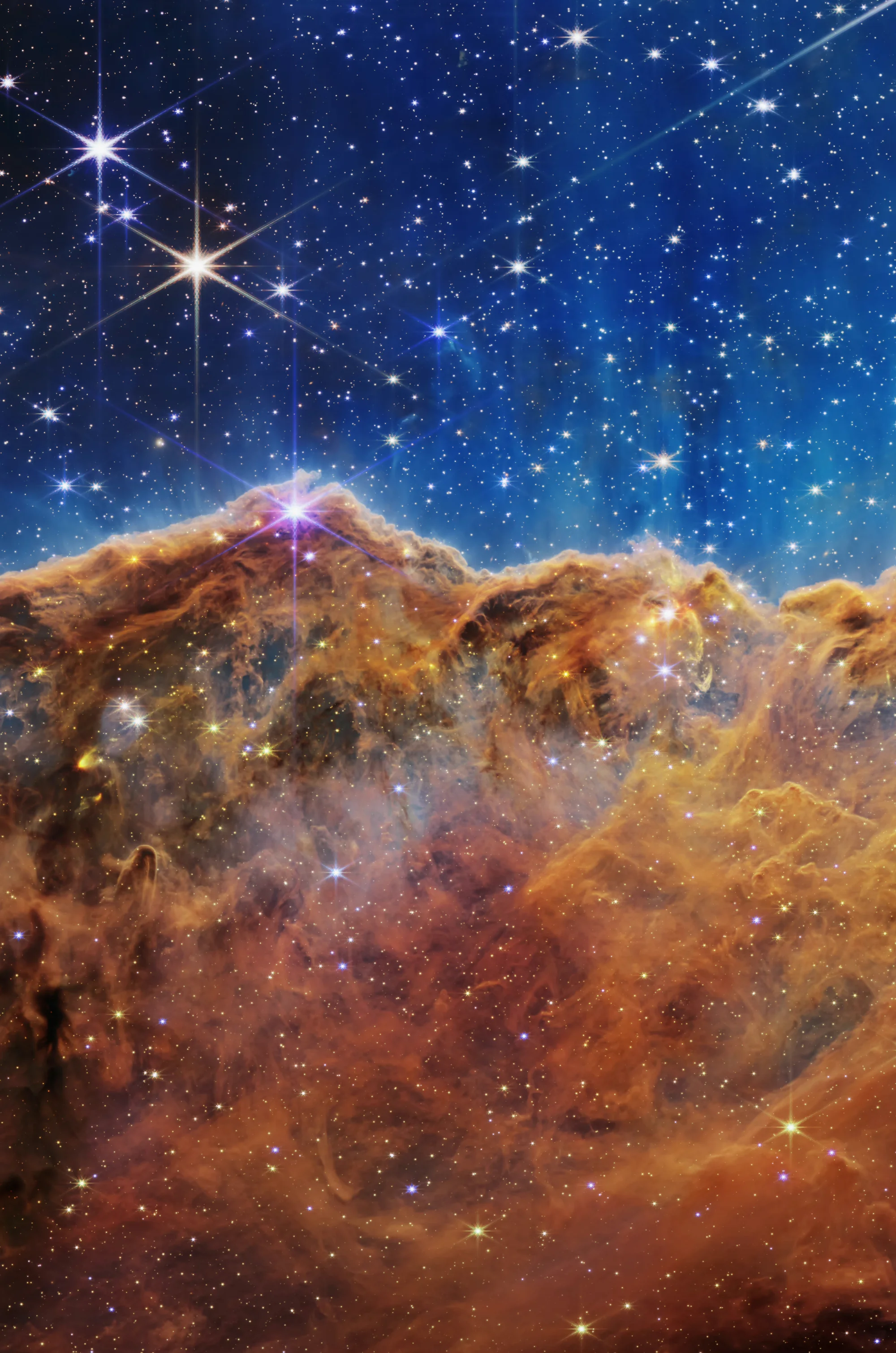 在月光下的夜晚看起来很像崎岖的山脉,实际上是船底座星云附近一个年轻的恒星形成区 NGC 3324 的边缘。这张照片是由 NASA/ESA/CSA 詹姆斯韦伯太空望远镜上的近红外相机 (NIRCam) 在红外光下拍摄的,它揭示了以前被遮挡的恒星诞生区域。