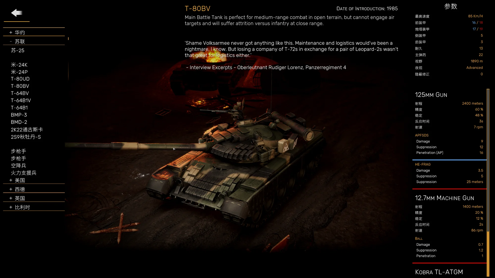 自带中文汉化,绝对是不影响玩的程度,但百科里的单位介绍还没翻译。而且目前这游戏明显是有带嘤单位建模的,但却没有带嘤陆军可用——北约甚至有比利时陆军能用,不知道是制作组和带嘤有仇,还是带嘤自有国情在此?(《人间地狱》也没英军,不悦)