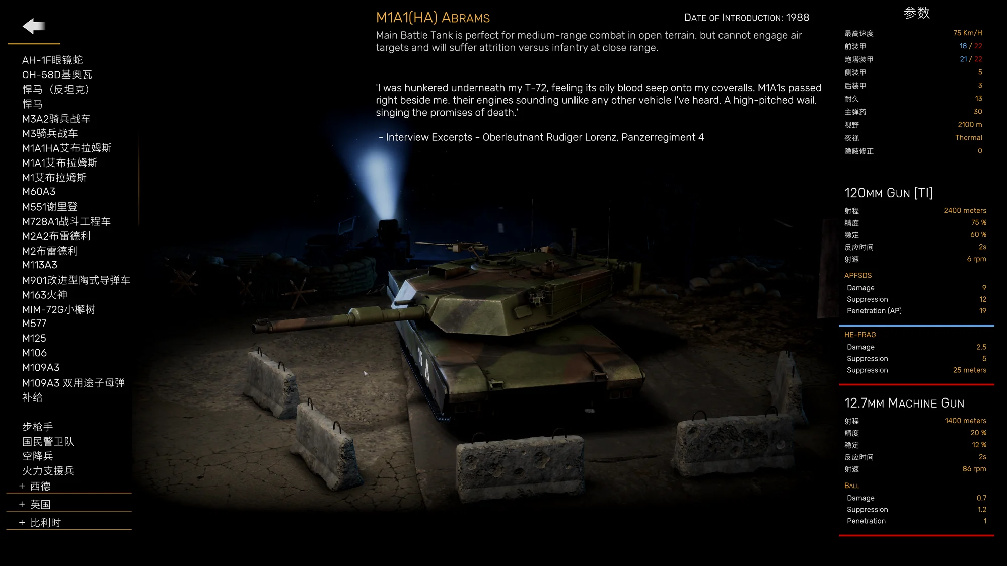 玩家能从北约和华约阵营选择部队。北约阵营目前可用的有美国,西德和比利时(待会吐槽这个);华约就是苏联和东德。