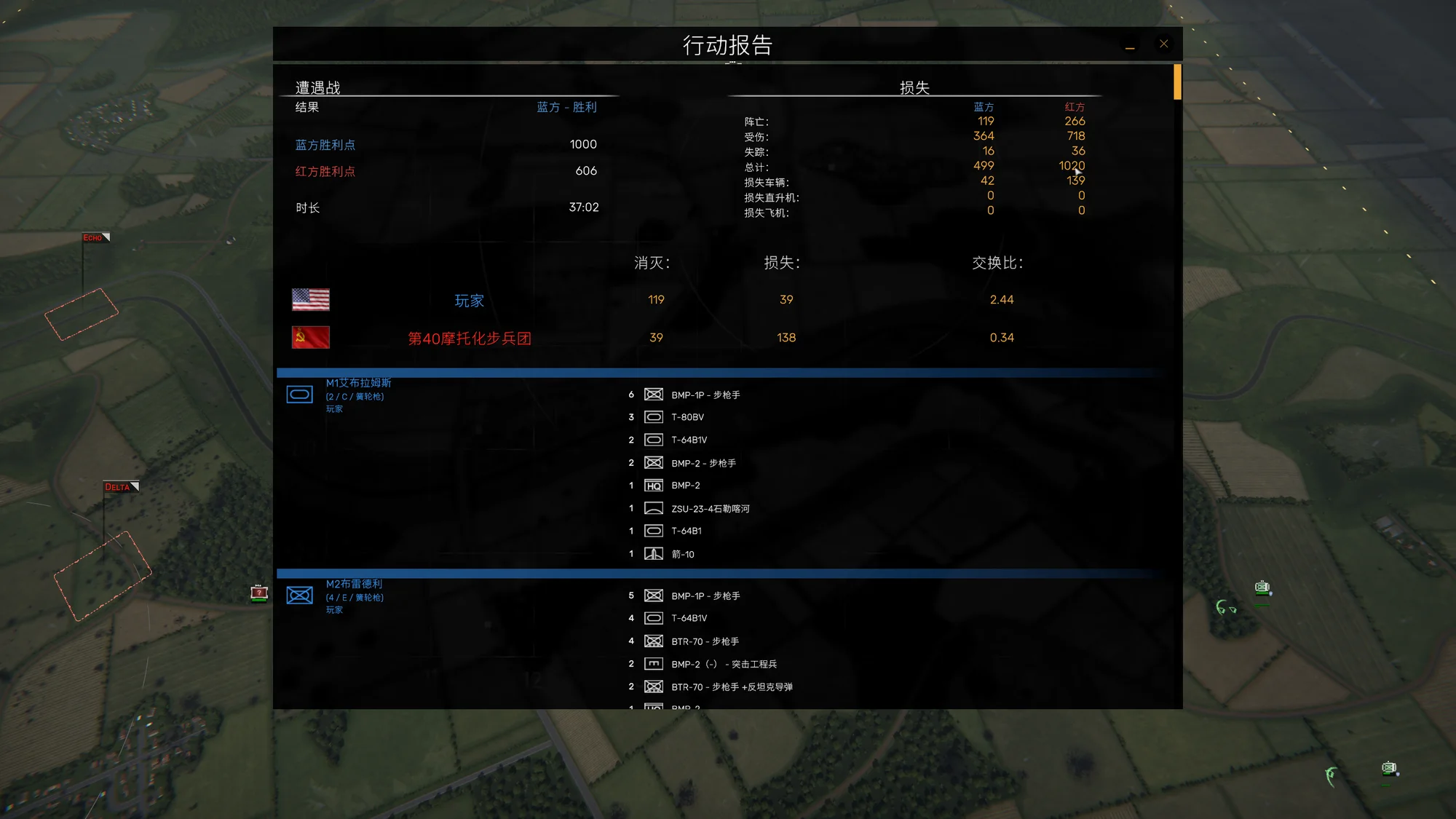 只浅玩了一局还玩不出个所以然来,感觉步兵确实在这个框架内依旧很强,林子里一蹲,用反坦克武器打击坦克排的侧翼依旧好使;火炮的压制功能,以及直升机和空中支援用好了,也非常能控制住场面。对面来势汹汹的T-80,在没有防空火力的情况下突击就是被直升机点名的命运。一局结束后有很详细的作战结算,可以精确到每支部队具体在什么时间被对面哪支部队干掉。
