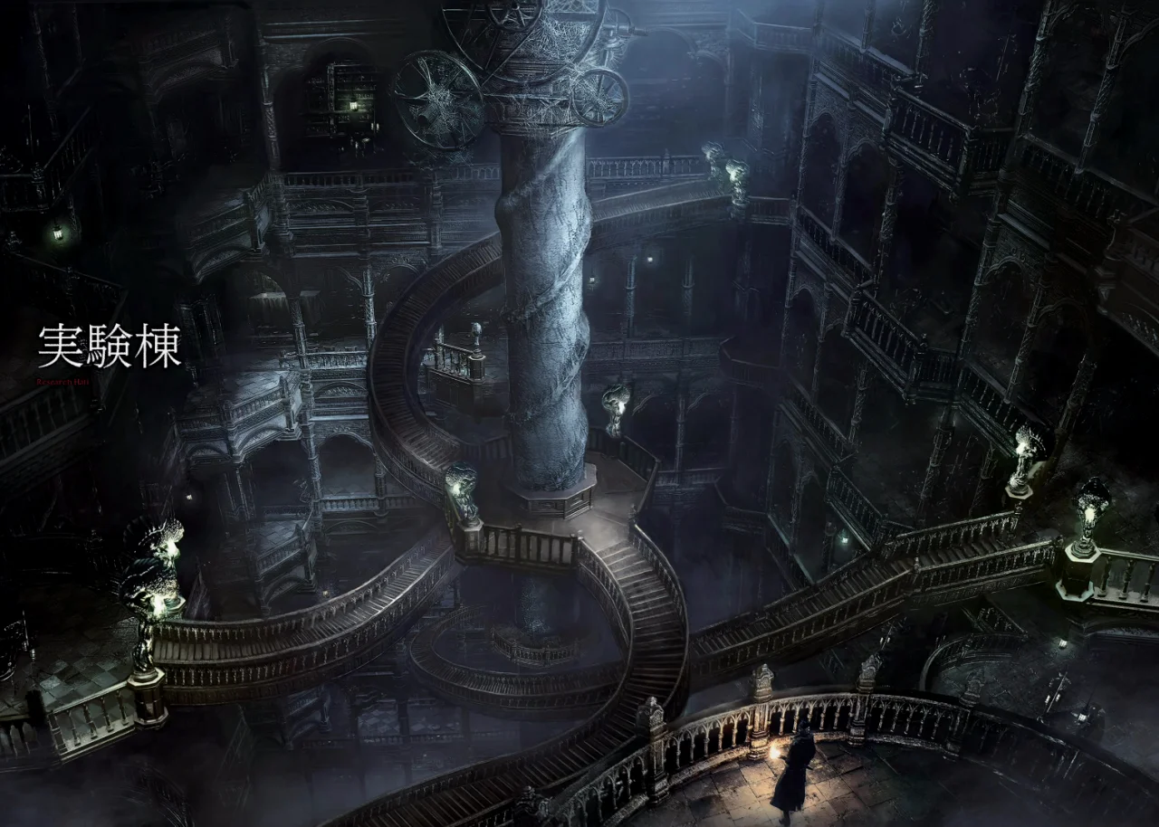 更绝的是 FromSoftware 的地图设计艺术,作为一张具有地形变化的纵深地图,场景中心是连接各个楼层的螺旋楼梯,整个研究栋可以视作为上位者准备的巨型开颅器,如巴别塔般,象征着人类的野心。玩家推动地图最高处的机关后,楼梯缓慢旋转,上位者的秘密随之揭示。