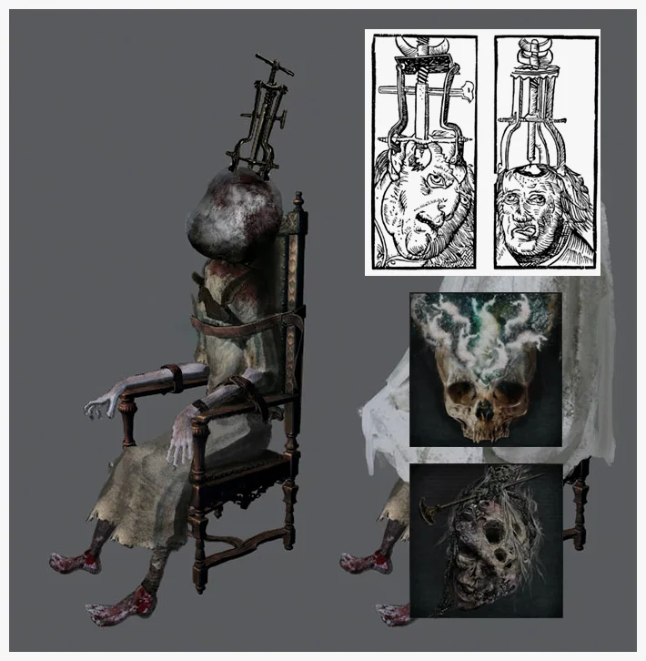 研究栋是老猎人资料片的第二张地图,场景里有不少病人尸体,头上插着造型诡异的器械,其原型是欧洲十六世纪的开颅工具。