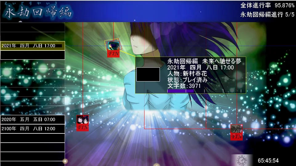 全篇章通关。刨除挂机的水分时间应该也花了至少55小时以上。另外全文本进度没有达到100%有些奇怪,但应该也只是少了些对正文剧情补充的里route。