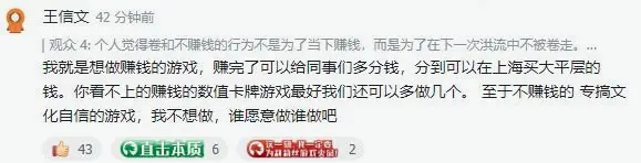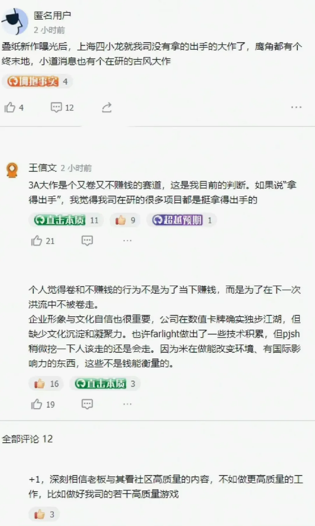 分享一个前几天看到的,莉莉丝游戏(刀塔传奇剑与远征)创始人兼CEO王信文:“我就是想做赚钱的游戏,赚完了可以给同事们多分钱,分到可以在上海买大平层的钱。你看不上的赚钱的数值卡牌游戏最好我们还可以多做几个。至于不赚钱的专搞文化自信的游戏,我不想做,谁愿意做谁做吧。” 配图是在他们公司内部平台的讨论,看完他的言论,我感觉还挺真实的,被点醒了。