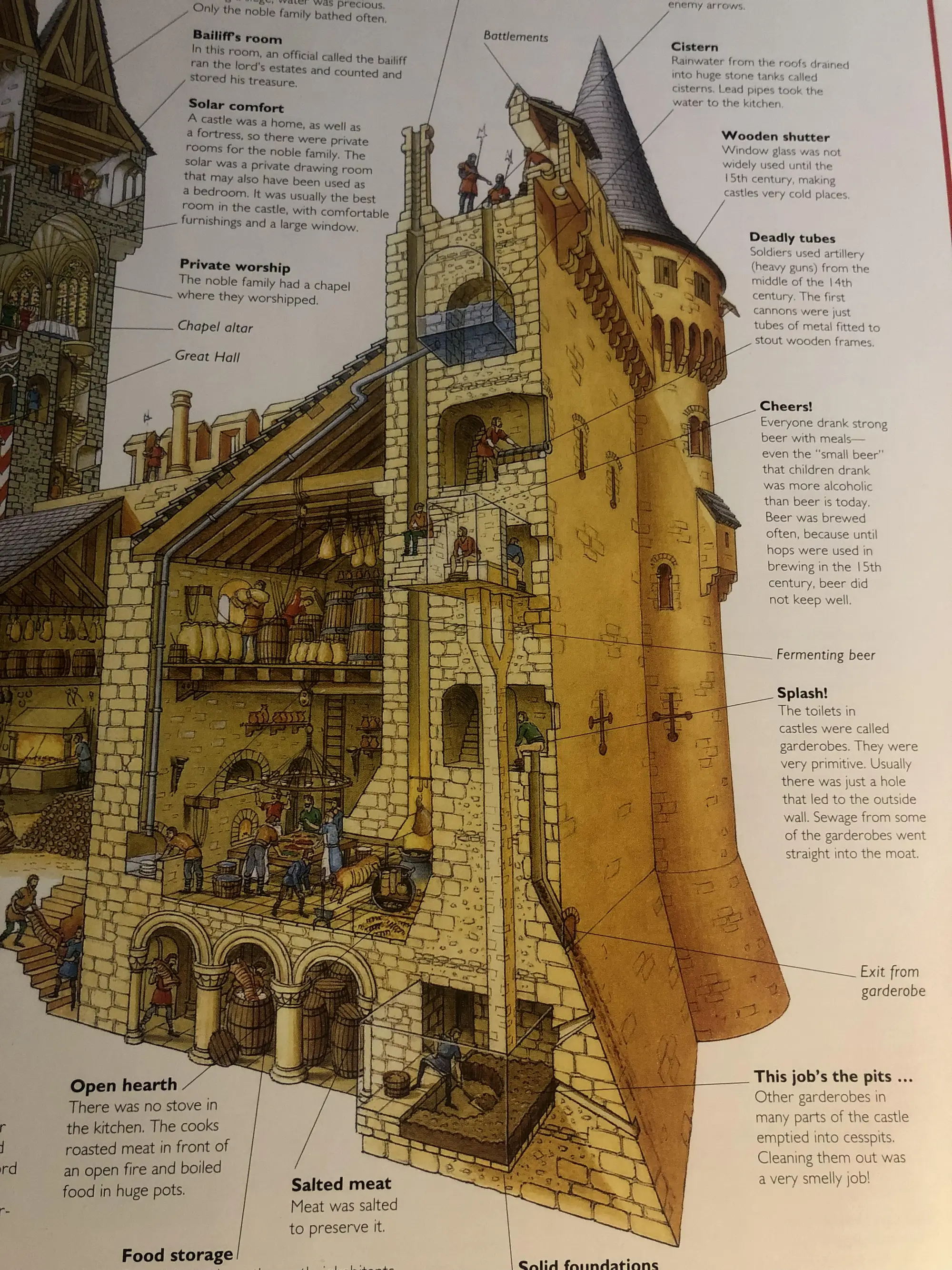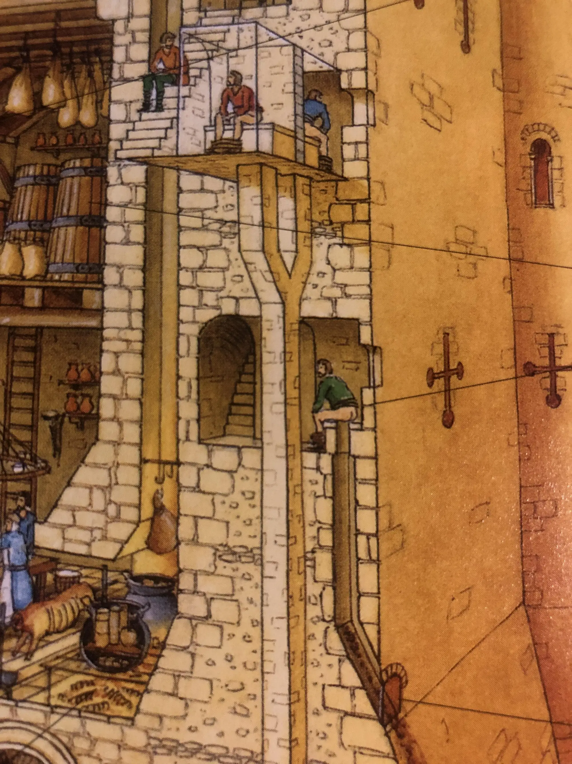 以城堡中蹲坑的方式,可以推得此城堡建于1306年以后, 仔细看下水道会有一个迂回,防止长矛直接捅刺,旁边的坑道,排泄物则会直接流入护城河,当然还有一种非常大气的顶层设计,通透,飞流直下三千尺的感觉,当然私密性差强人意,两个守卫和你谈笑风生。如果是你,在这座城堡里,你会选择哪种如厕方式呢?