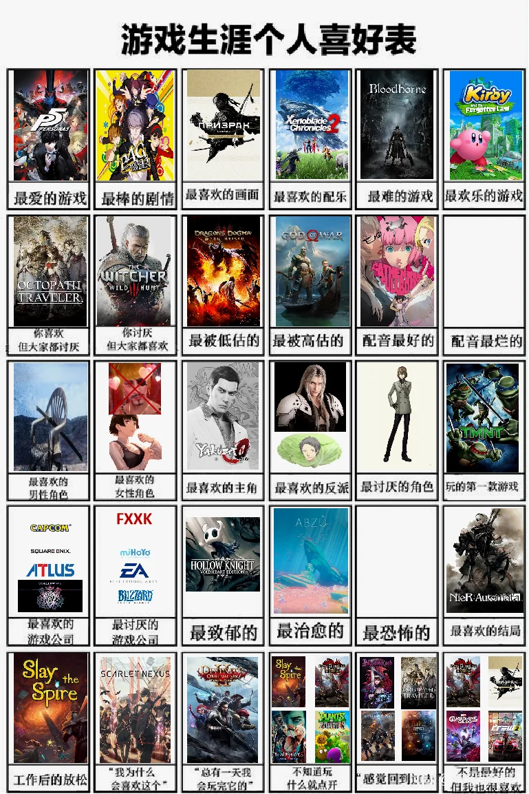最棒的剧情:24图版里填的是十三机兵防卫圈,填这图时候想了想好像十三机兵更打动我的是叙事方法以及对于“游戏”这一载体的运用,单论剧情我好像还是更喜欢p4g欸