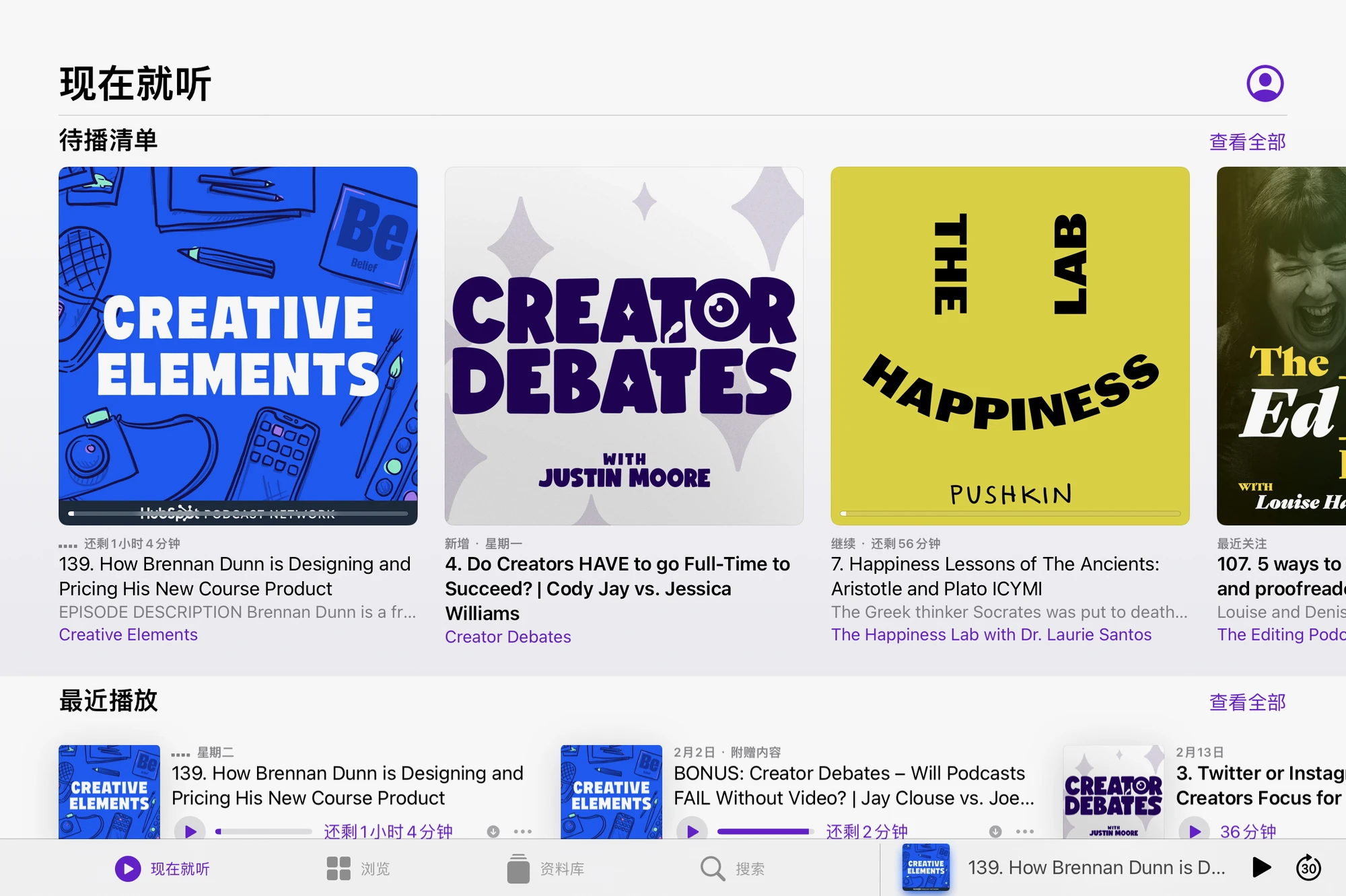 我目前长期在听的播客只有两个,一个是 Jay Clouse 的 Creative Elements,作者致力于帮其他创作者走上专业之路、靠着内容创作做到月入 4 万刀,每期都会采访各个平台的头部创作者,交流创作经验,对致力于成为专业内容创作者的我来说完美满足需求,不管是发展 Twitter、YouTube、Tiktok 还是 Linkedin(或中文网络类似的平台)都能有启发💡