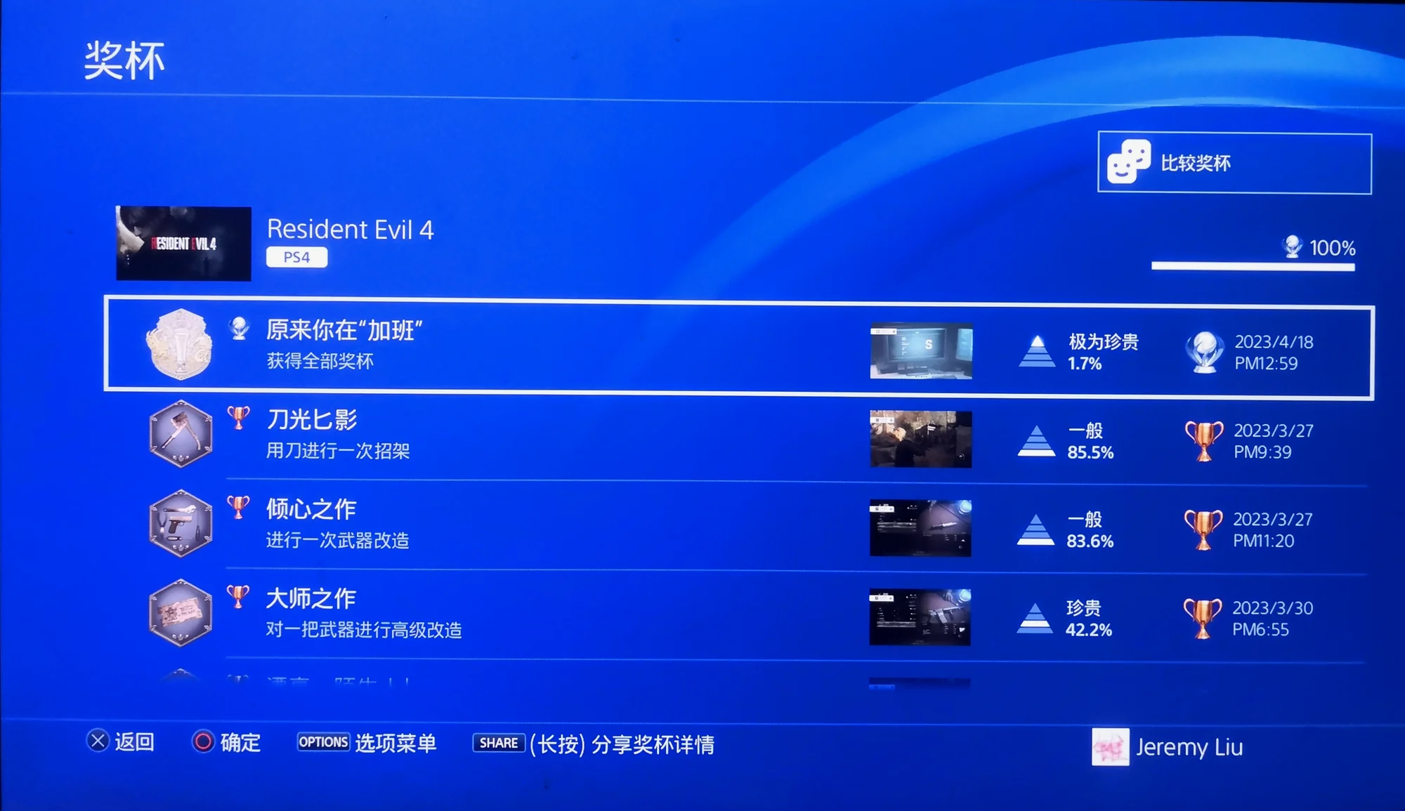 PS4版RE 4白金了,这个版本最痛苦的是狙击枪开镜严重掉帧,几乎没法使用该武器。再跑一两个周目练练速通就等dlc吧