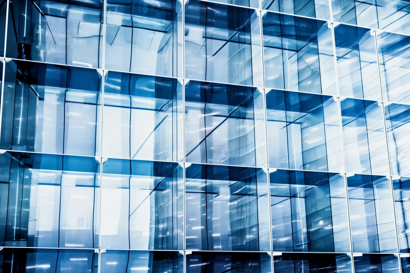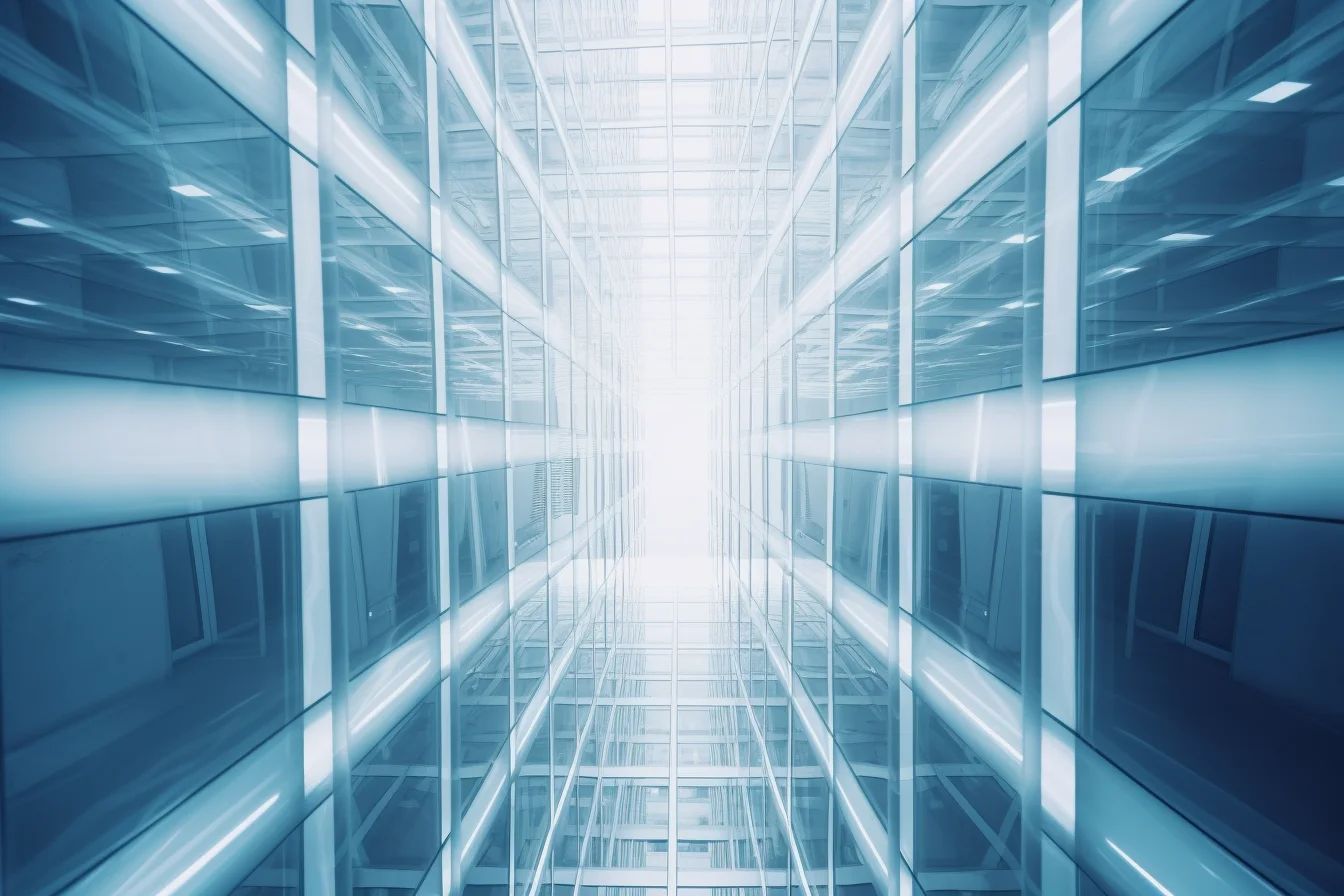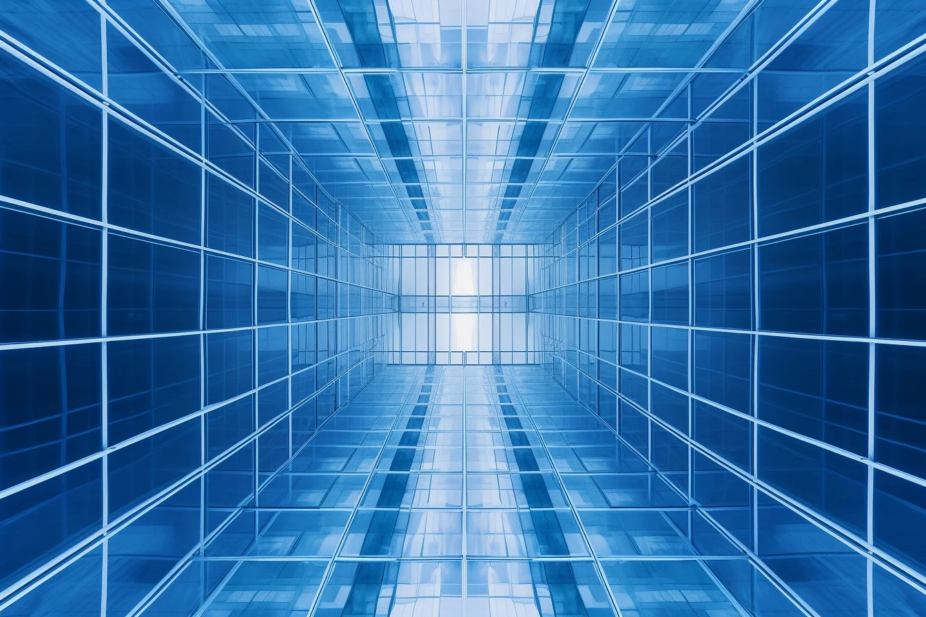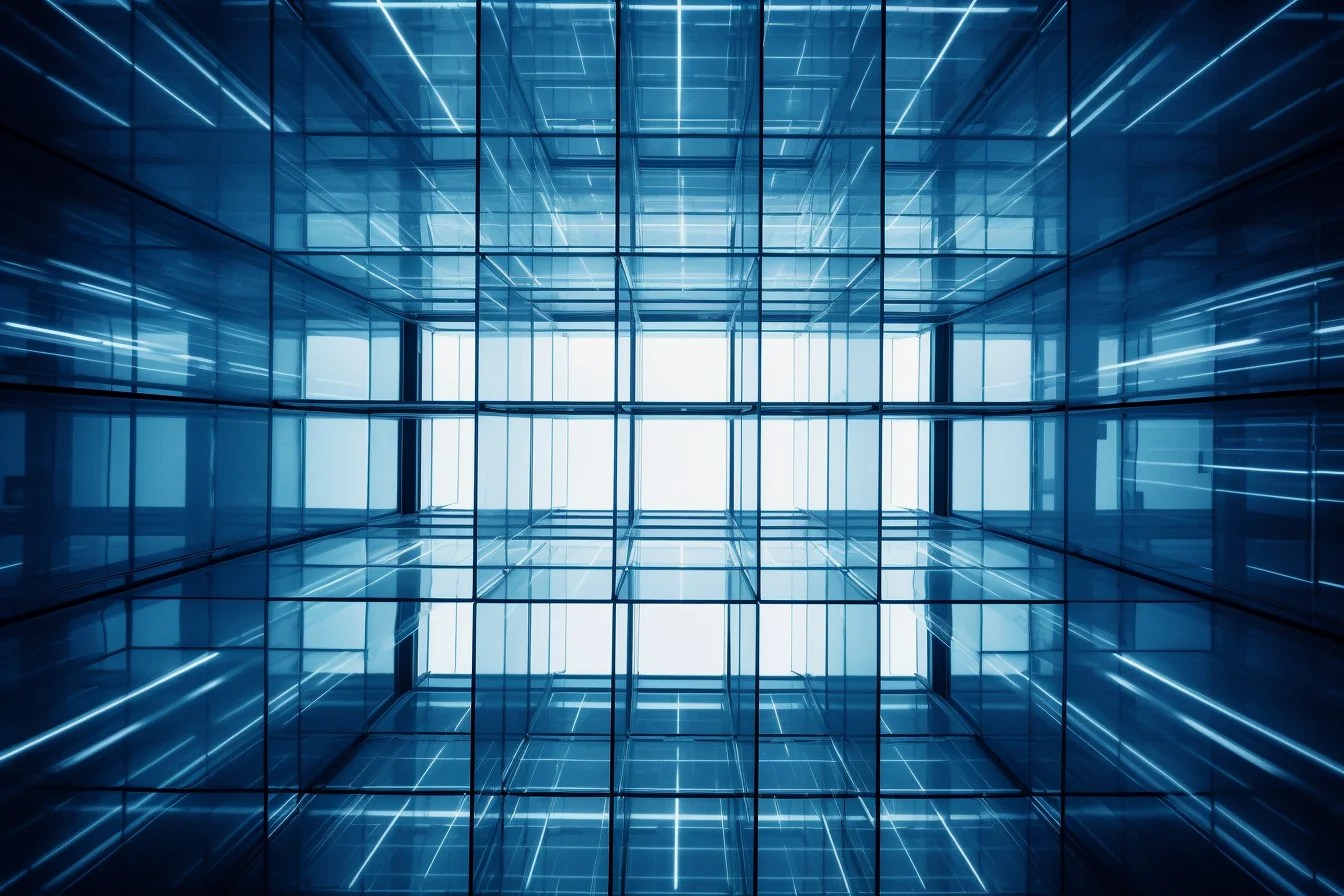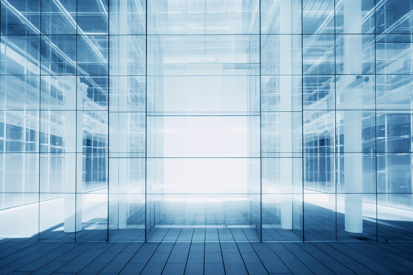 Perspective structure with perfect symmetry, Opaque white pure glass curtain wall with blue light coming through the opening, in the style of monochrome abstraction, grid work, layered translucency, matte photo, philipp otto runge, infrared, spatialism high-key lighting, abstraction-création kodak elite chrome extra color, juxtaposition of light and shadow, clear colors smooth, modern minimalist, 3d render --ar 3:2