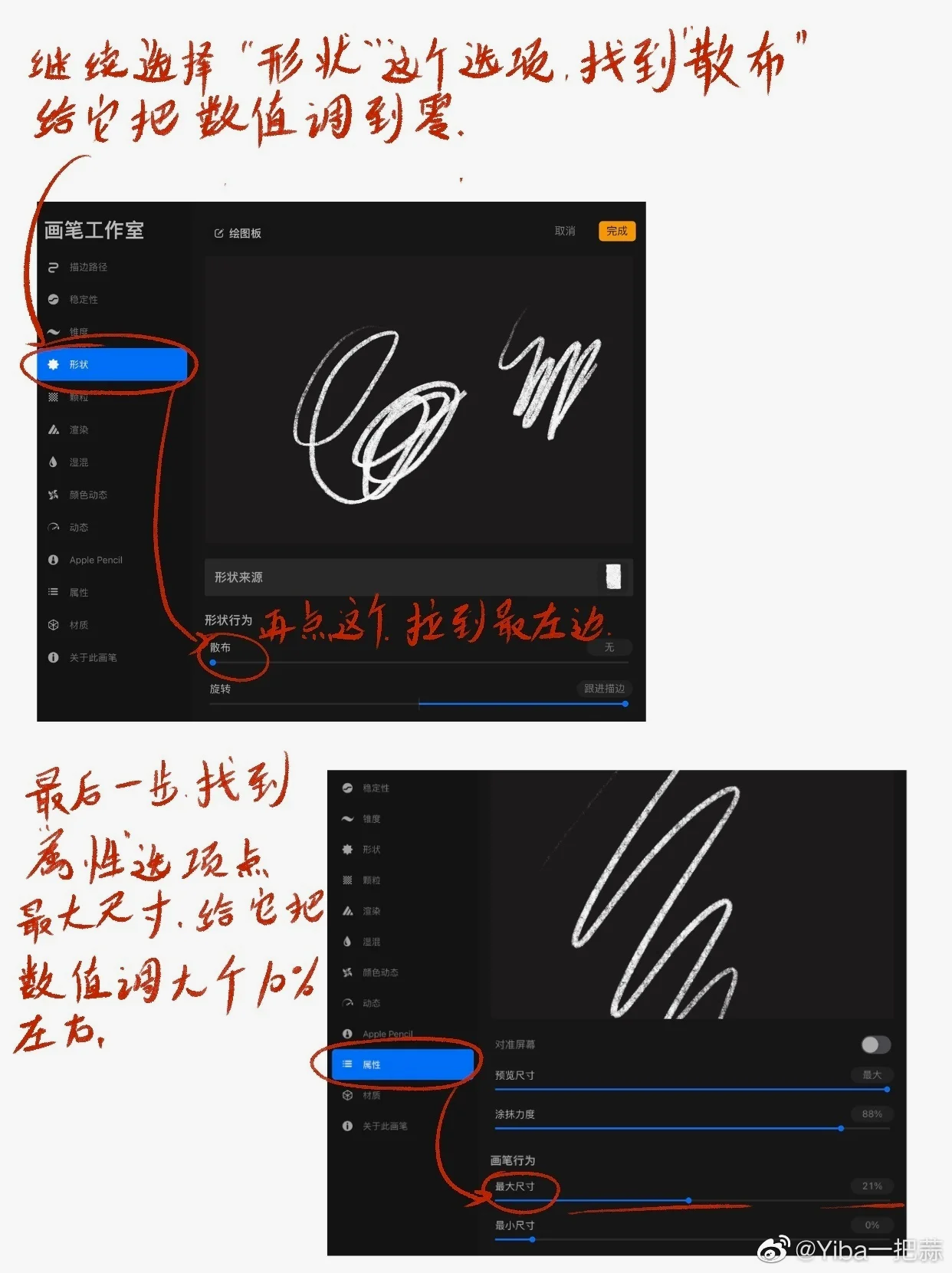 接着我们选择形状在形状行为下面找到散布我们把这个散布给它拉到零,这样做也是让我们笔刷的边缘形更加的规整,画起来会更加的流畅。