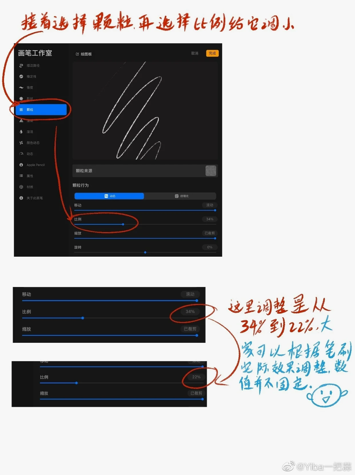 然后我们接着选择颗粒这个选项,在颗粒行为-动态下方有一个比例我们适当的把这个比例给它调小,可以入我们的笔刷颗粒感更加聚拢,线条感更加强烈一些,然后我们拿这个笔刷去画的时候画线毛躁的情况就会得到一些缓解了。