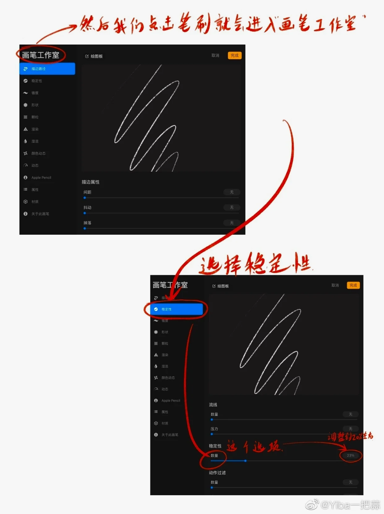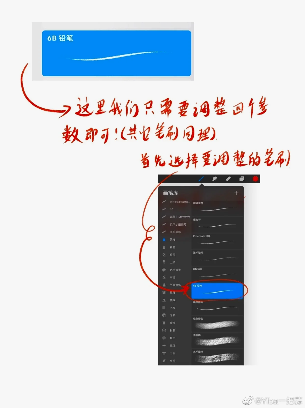 这里我们以勾线比较常用的6B铅笔做示范,首先我们需要找到我们调整的笔刷然后点击它就会跳转到我们的画笔工作室,然后我们先点击稳定性这个选项然后点击数量给它调整到百分之二十左右,其他笔刷同理,这么做可以让这个笔刷画起来更加稳定,就相当于你再拿这个笔刷画的时候你的手变稳了,那么相应的你的线条也会更加流畅啦。